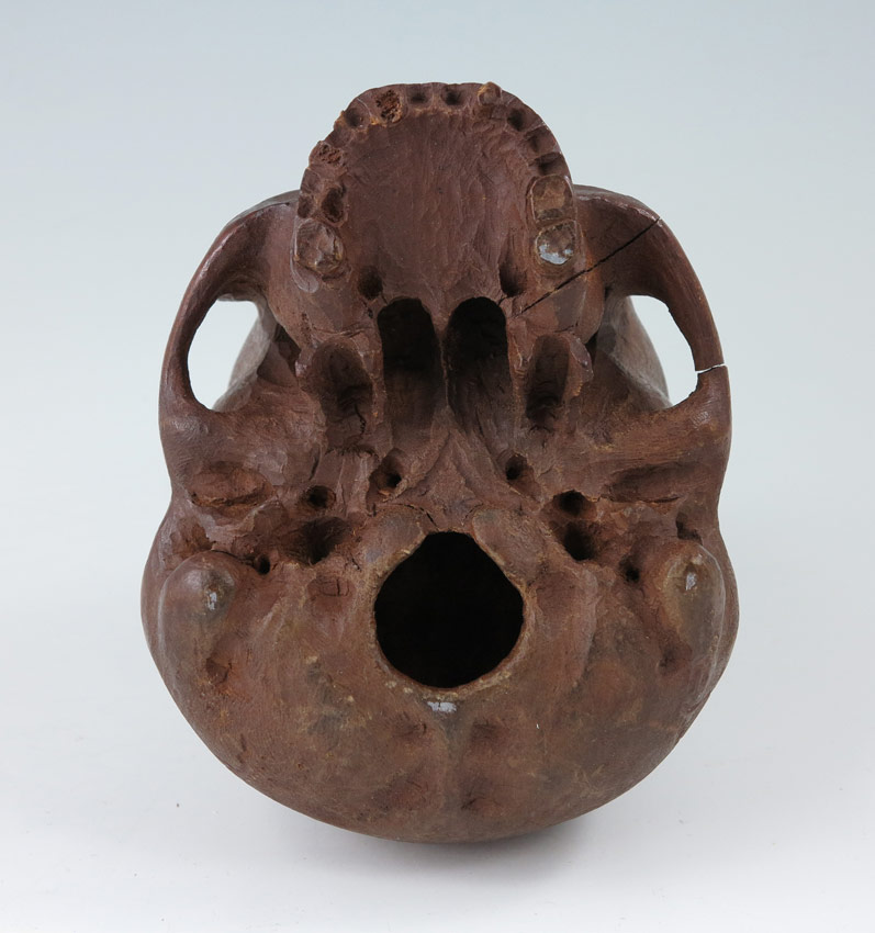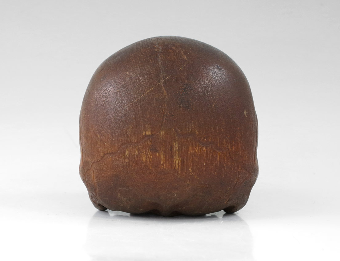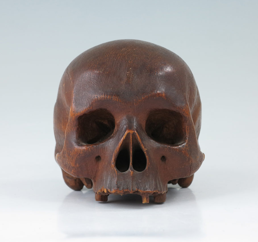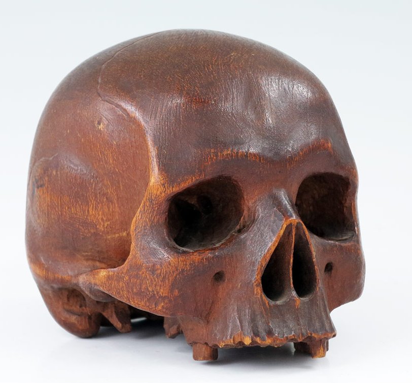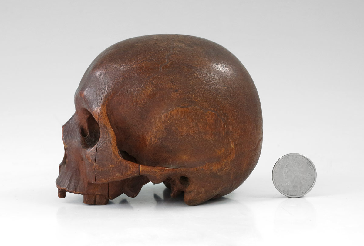 EARLY CARVED WOODEN SKULL: Former collection of Benedictine monk, 3 3/4'' h. x 4 1/2''d. x 3 1/2''w. Exceptional proportion and patina, gifted in 1973 to current owner. Purportedly older than 18th C. The following is a description and explanation provided by the consignor: Intricately hand carved wooden skull. Used for meditation upon death by Benedictine Monks in Europe. Dating from 17th century, Italy, according to the priest-monk, Italian, Benedictine who previously owned this highly detailed lifelike carved wooden sculpture. It was given as a gift to me when I (Father Andrew John Winchek) was a seminarian living in Rome from 1971 to 1982. I received three advance degrees, magnum cum laude, at the Pontifical University of Saint Thomas, also known as the Angelicum, in central Rome, Italy. There I specialized in theology and spirituality. Presently I am a retired missionary with tropical illnesses, having served the poorest of the poor in Southeast Asia for four decades. I was deeply honored to have had Blessed Mother Teresa as a spiritual mentor while in Rome. Then after my ordination she blessed me by inviting me to be one of her retreat directors and spiritual guides. I personally used this skull as a meditation upon the reality of death. It has been in my possession for over forty years (from 1972). I am auctioning this antique to raise funds for the projects I began and continue to support over the many years in North Eastern Thailand. This wooden skull can also serve as an artist's still life prop. Sincerely, Reverend Andrew John Winchek