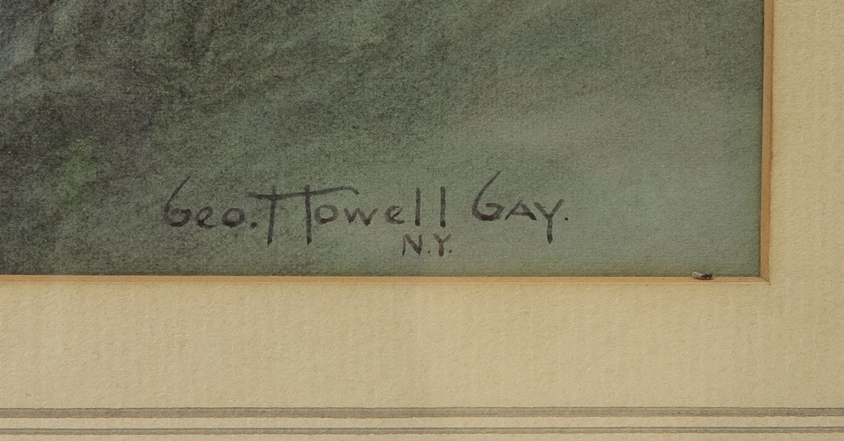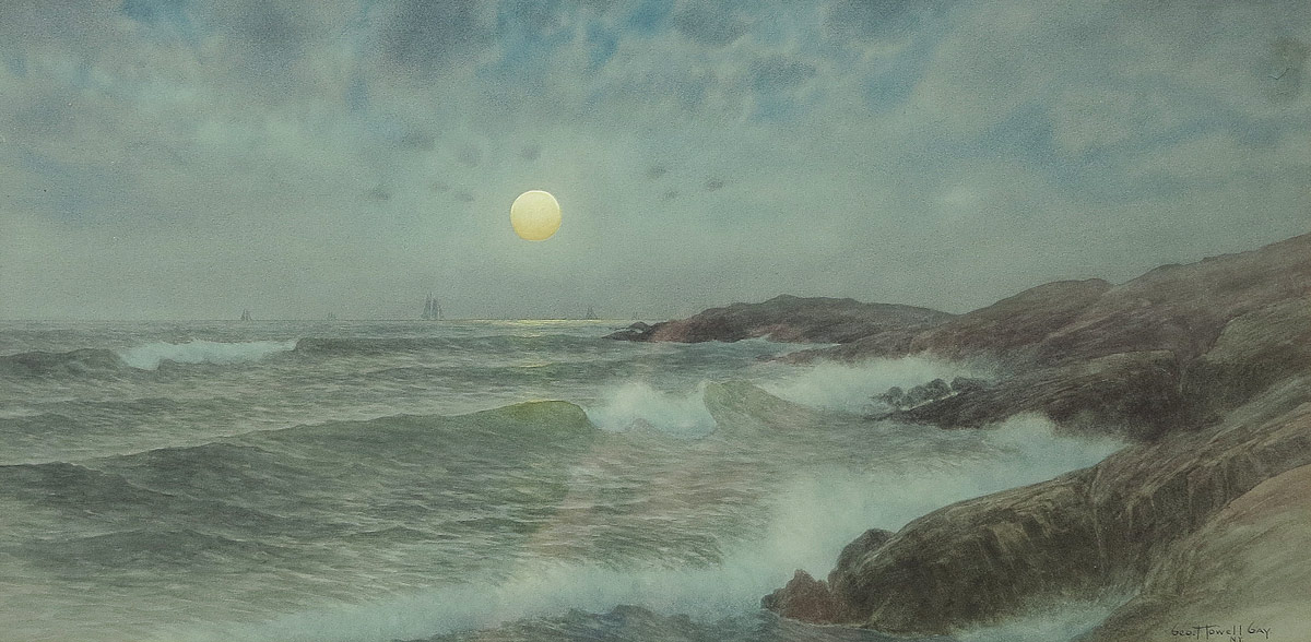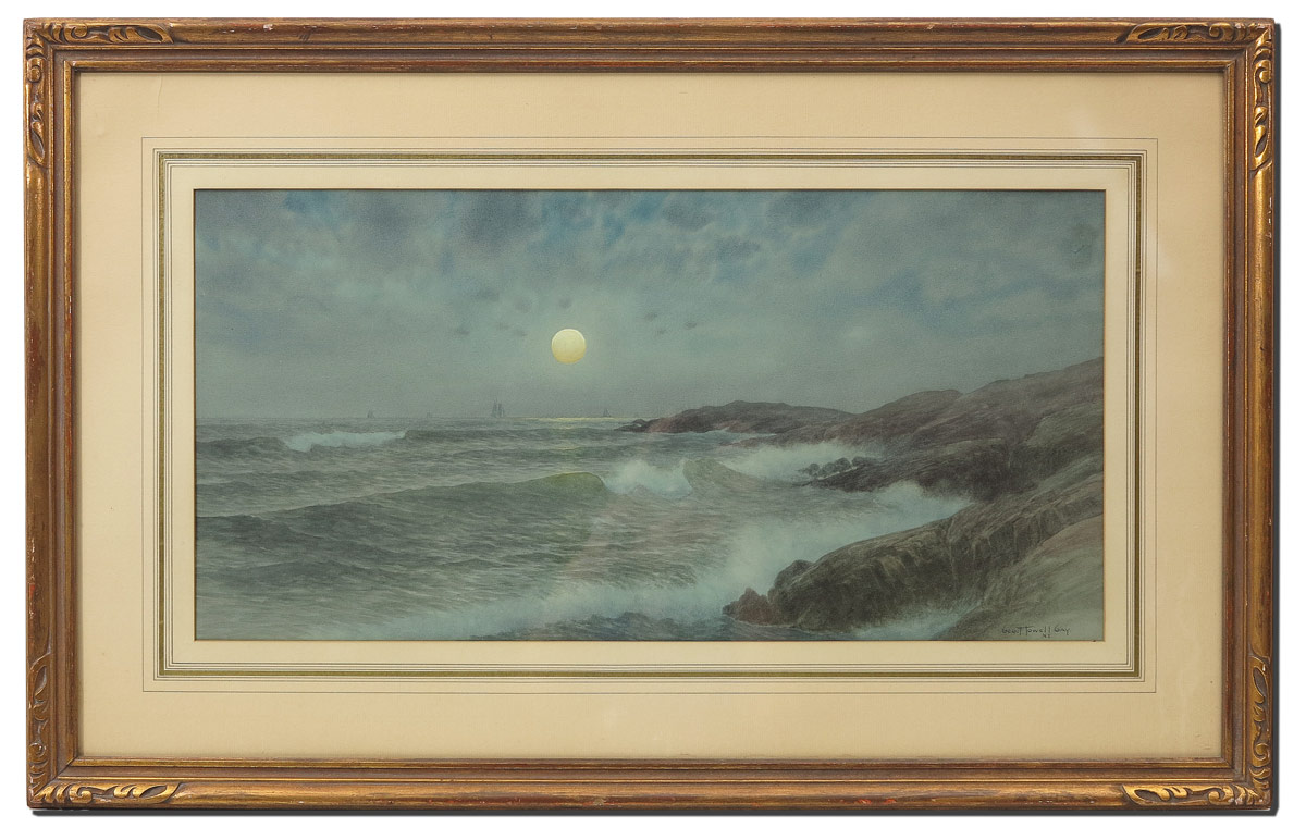 GAY, George Howell, (American, 1858-1931): ''Moonlit Rocky Coastline'', Watercolor/Paper, Sight size 12 1/4'' x 25 3/4'', carved and gilded period frame with minor wear 22 1/2'' x 35 1/2''.