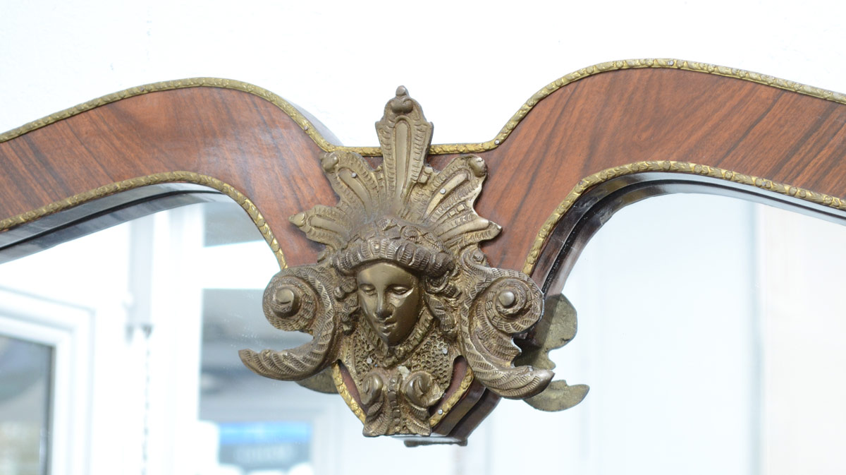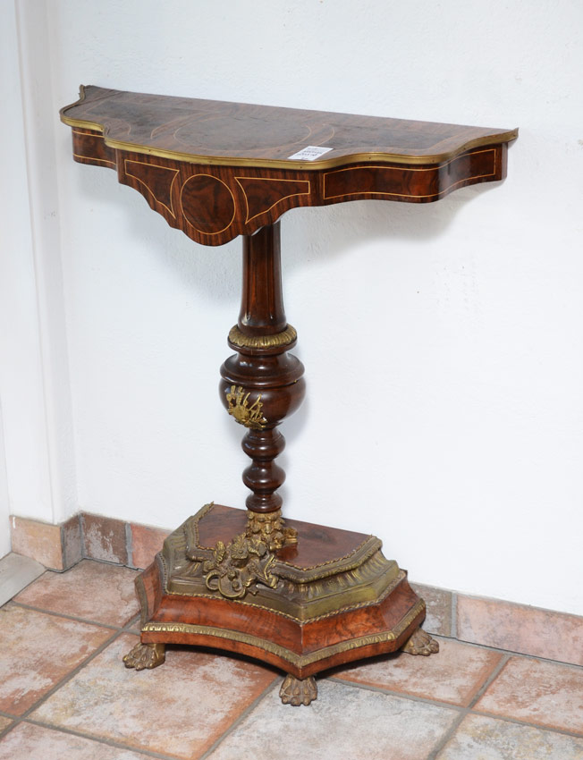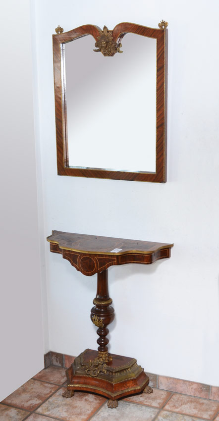 ORMOLU & INLAY DEMI FOYER TABLE AND MIRROR: Shaped top rimmed in ormolu, inlay throughout, ornate tiered pedestal base on paw feet. The mirror is surmounted by a masqueron. Mirror measures approx. 32'' x 26''. Table 34''h. x 29'' x 12''.