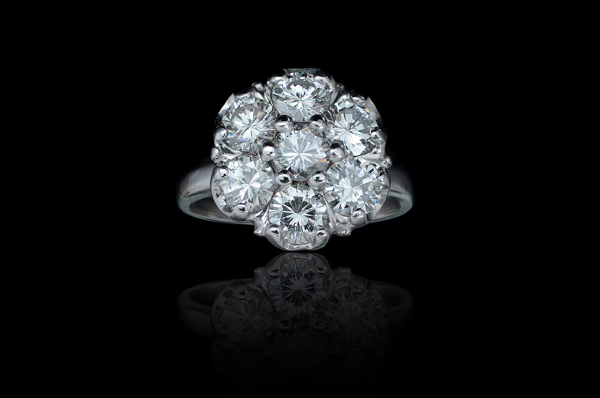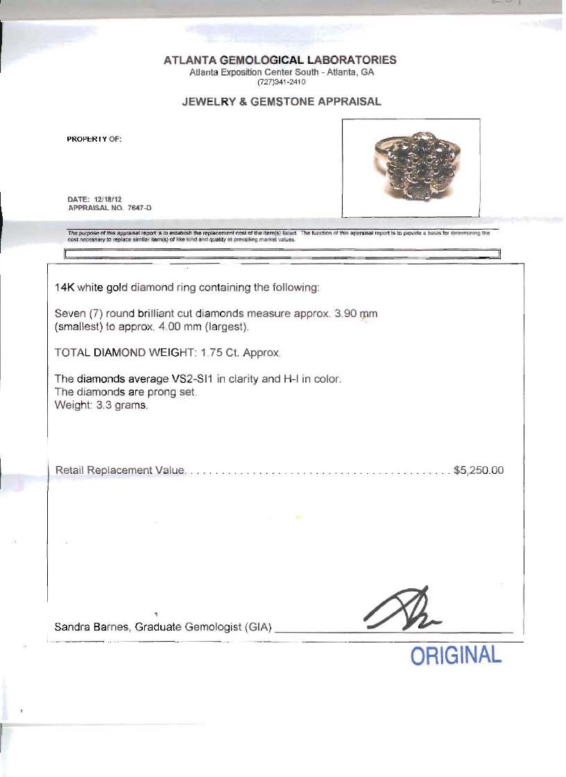 1950's DIAMOND DINNER RING: 14k white gold ring with 7 round brilliant cut rings totaling approx. 1.75 Ct., averaging VS2 in clarity and H-I color. Prong set. Size: 3.5. Weight: 3.3 grams. Sold with current Atlanta Gemological GIA graduates appraisal for $5,250.
