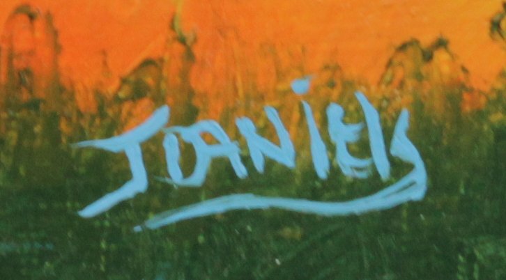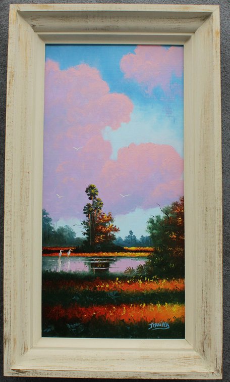 DANIELS, Johnny, (American, 20th Century): Florida Highwaymen backwaters scene with birds and vibrant pink clouds, OIL/Masonite, 24'' x 12'', painted molding frame 28 1/2'' x 16 1/4''.