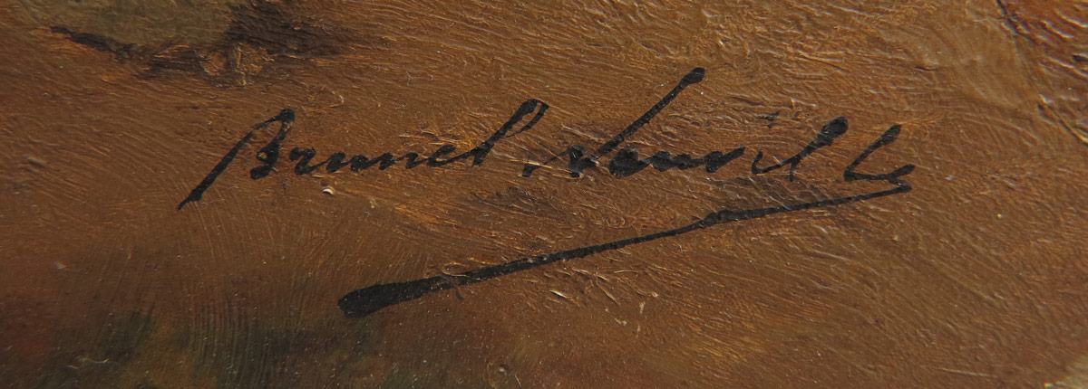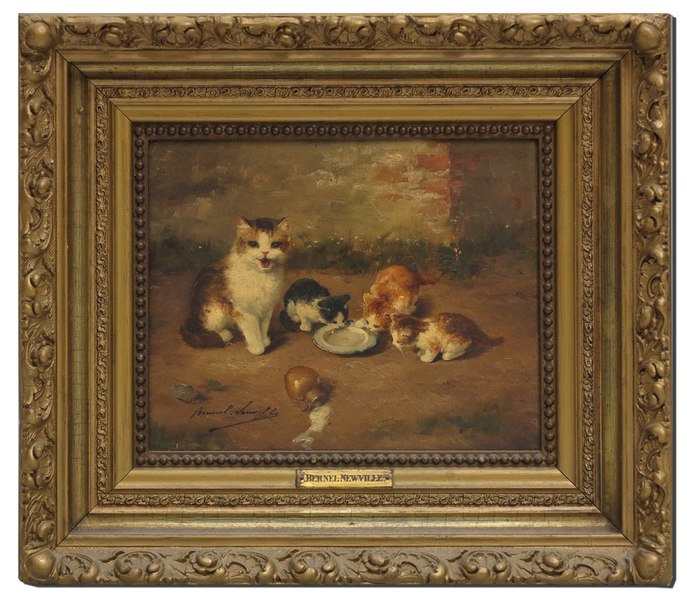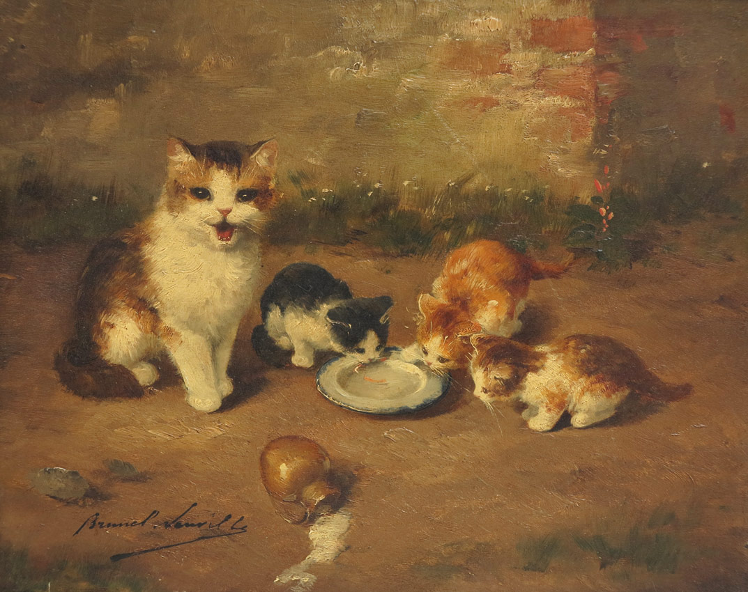 BRUNEL DE NEUVILLE, Alfred Arthur, (French, 1851-1941): Cat and Kittens Drinking From a Bowl of Milk, Oil/Wood panel, 8 1/2'' x 10 1/2'', signed lower left, encased in period gilded gesso frame with overpaint, 14 1/2'' x 16 1/2'' x 2 1/2'' deep.