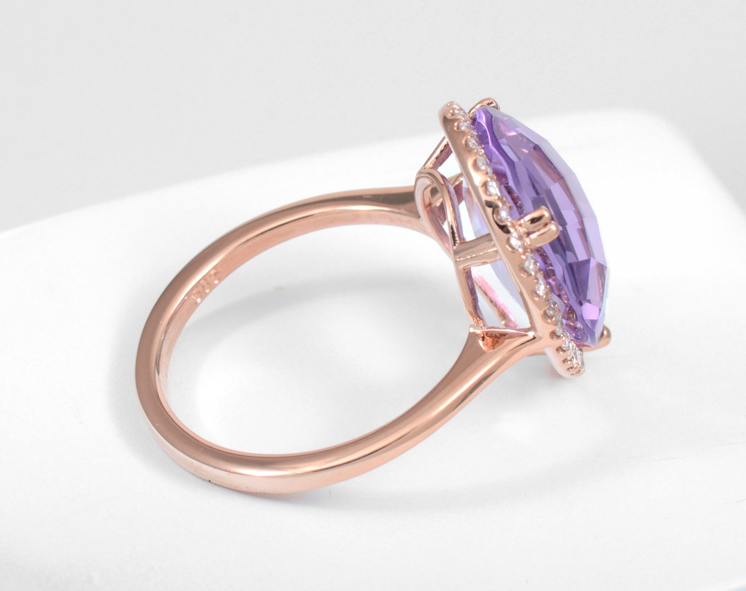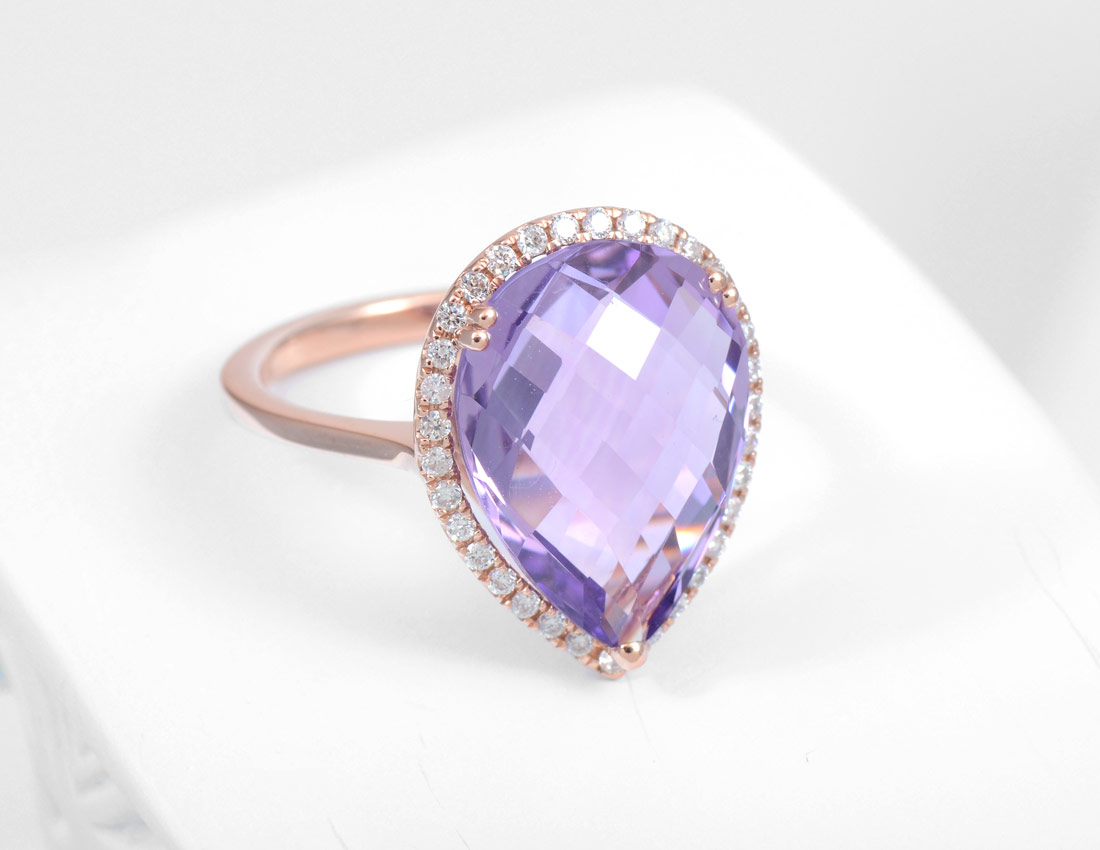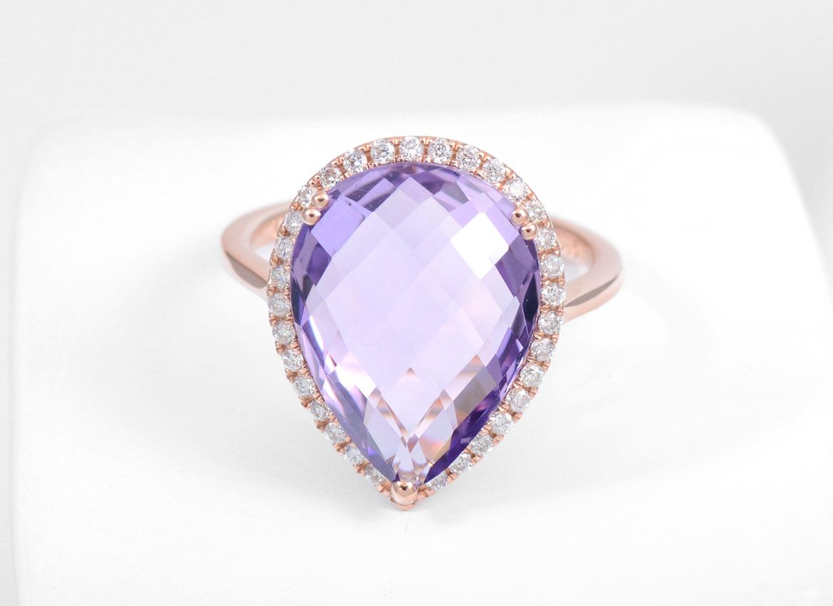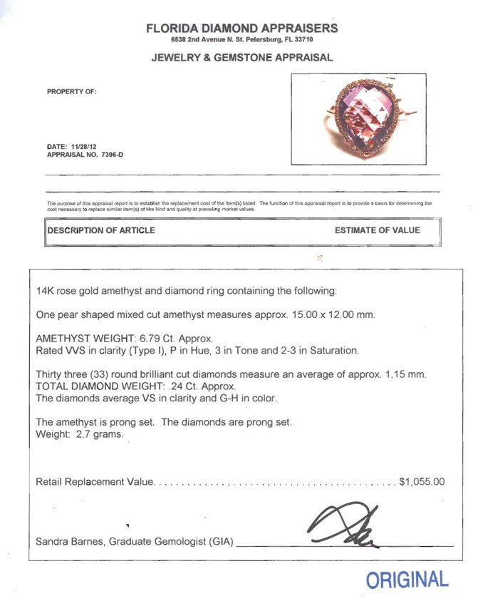 ROSE GOLD 6.79 CT PEAR SHAPED AMETHYST & DIAMOND RING: 14K rose gold ring centers an approx. 6.79 Ct amethyst, VVs in clarity. Framed by 33 round brilliant diamonds totaling .24 Ct., averaging VS in clarity and G-H color. Stones are prong set. Size 6.5. Weight 2.7 grams. Sold with current Florida Diamond Appraisers GIA graduates appraisal for $1055.