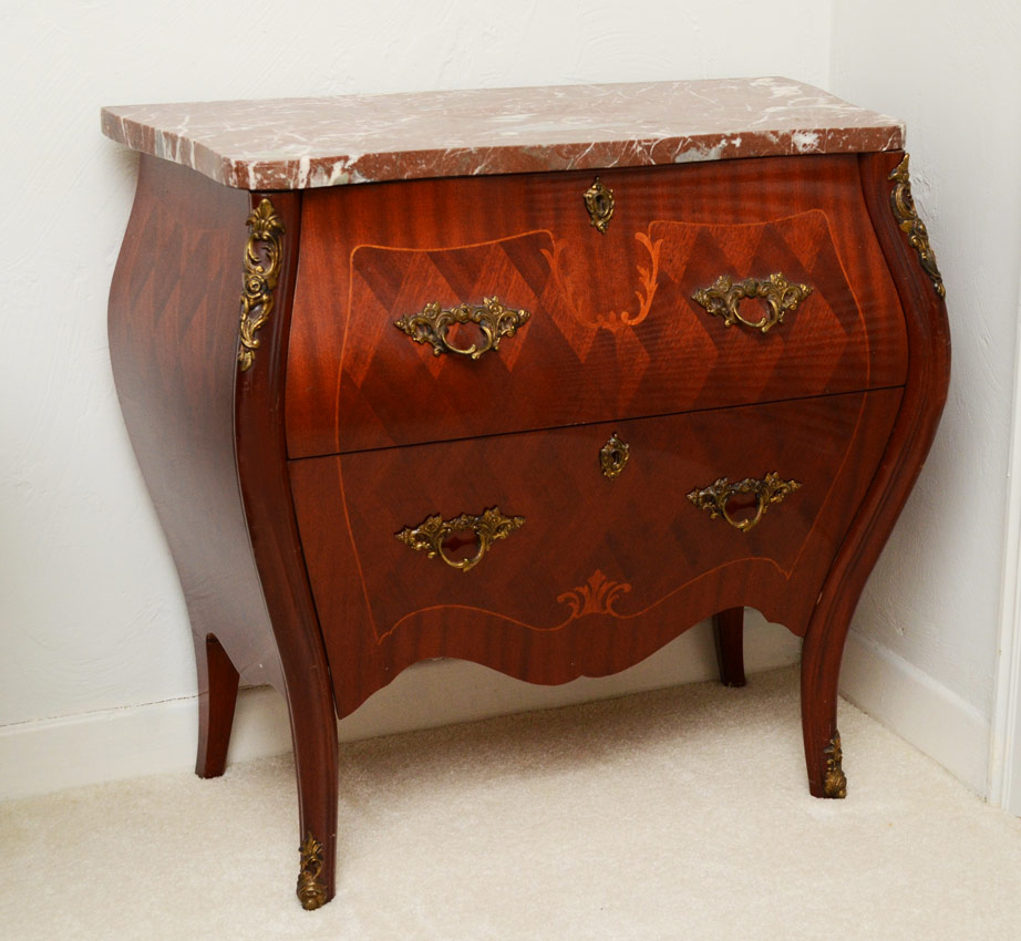 A DIMINUTIVE MARBLE TOP BOMBAY COMMODE: Patterned veneers and inlay. Rouge marble top over two drawers. Measures 26'' tall x 26 1/2'' x 13''.