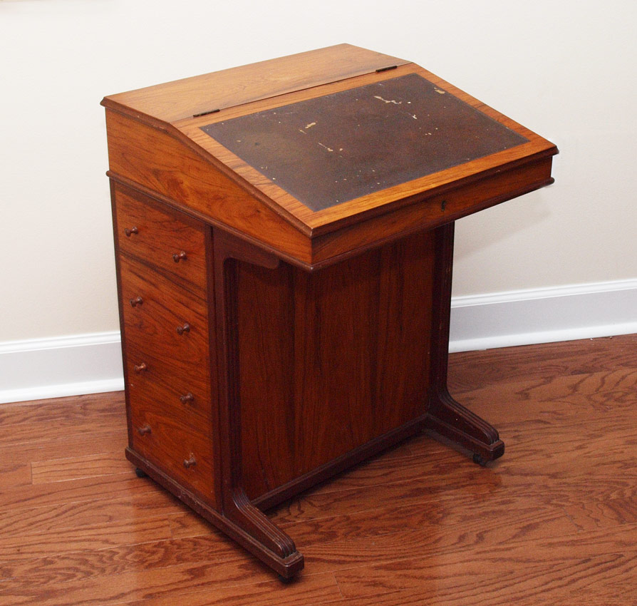 WALNUT DAVENPORT DESK: Lift top with leather writing surface. 5 drawers one side with top drawer having compartmented insert. Faux drawers opposite side. 30 1/4'' h. x 22 3/4'' x 21 3/4''.