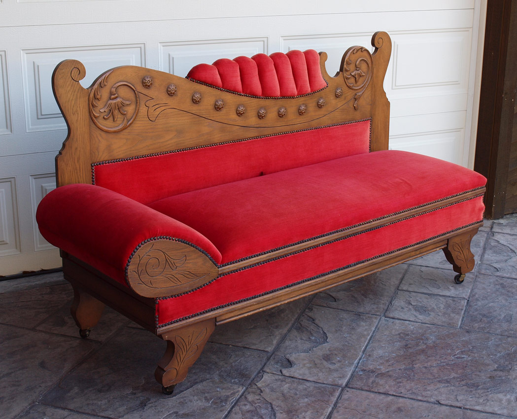 GOLDEN OAK CHAISE LOUNGE CONVERTS TO BED: Carved and shaped back with tacked red upholstery, carved legs on castors. 41 3/4'' h. x 73 1/2'' x 24 1/2''.