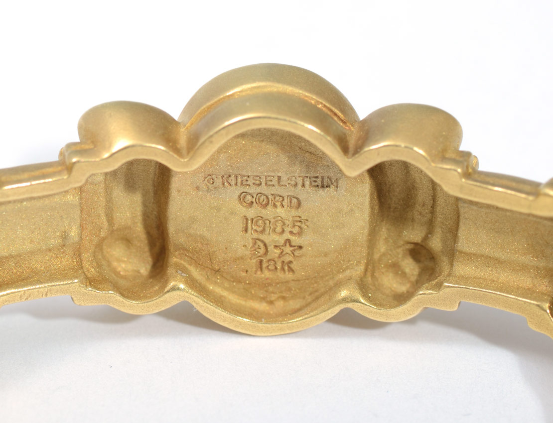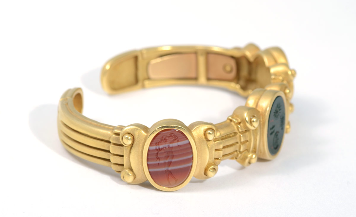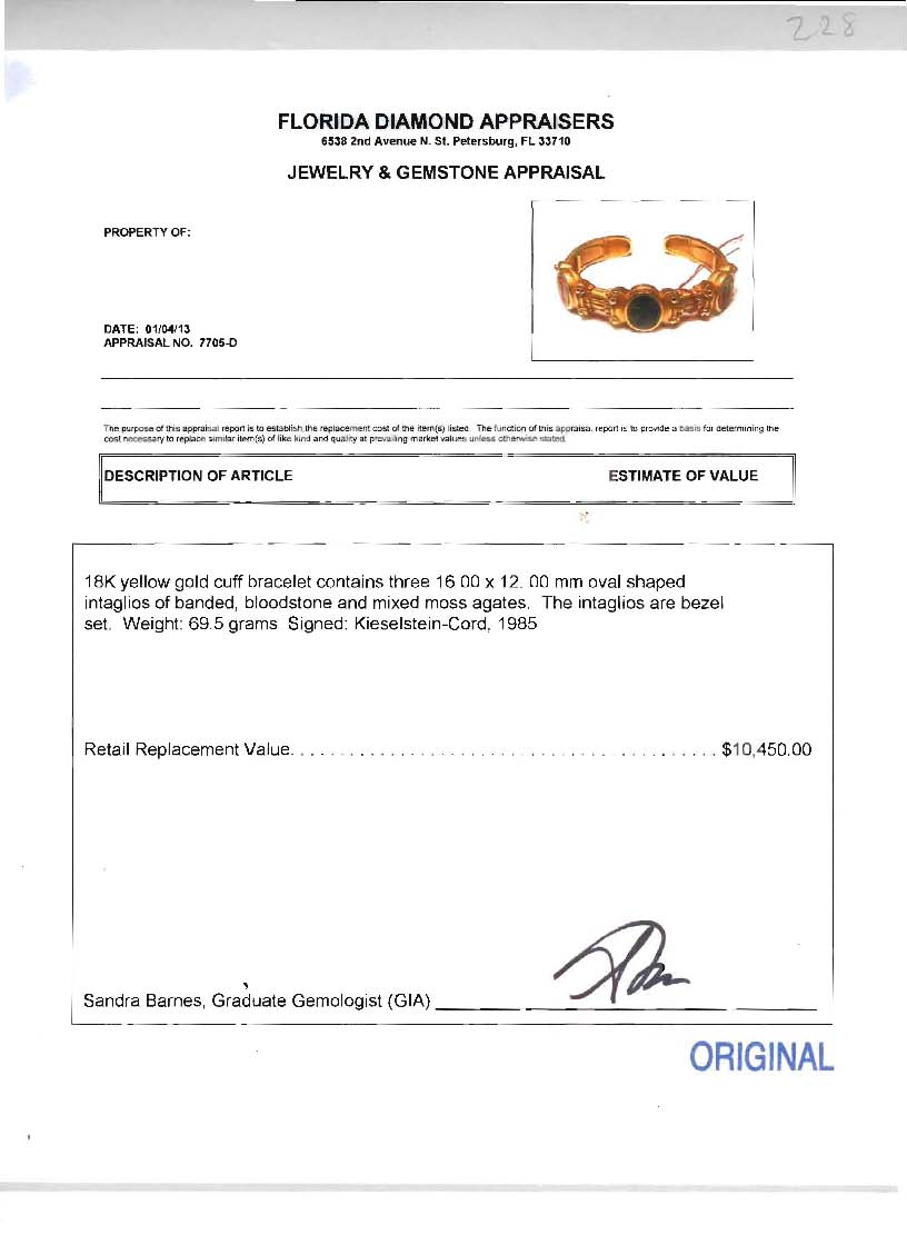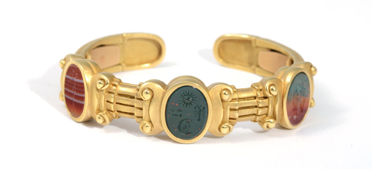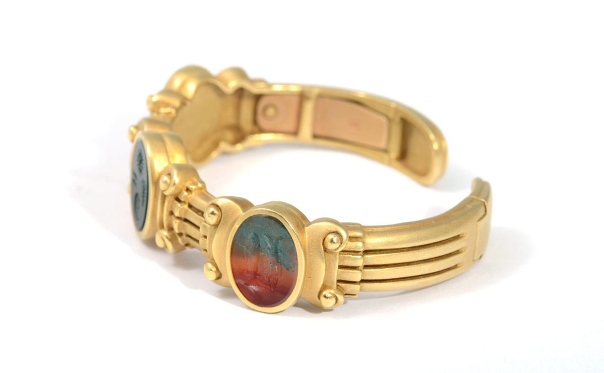 KIESELSTEIN-CORD 18K INTAGLIO BRACELET: 18K yellow gold cuff bracelet with 3 bezel set intaglios of banded bloodstone and mixed moss agates. The ends are hinged for ease of wear and safety. Signed Kieselstein-Cord 1985. Weight: 69.5 grams. Sold with current Florida Diamond Appraisers GIA graduates appraisal for $10,450.
