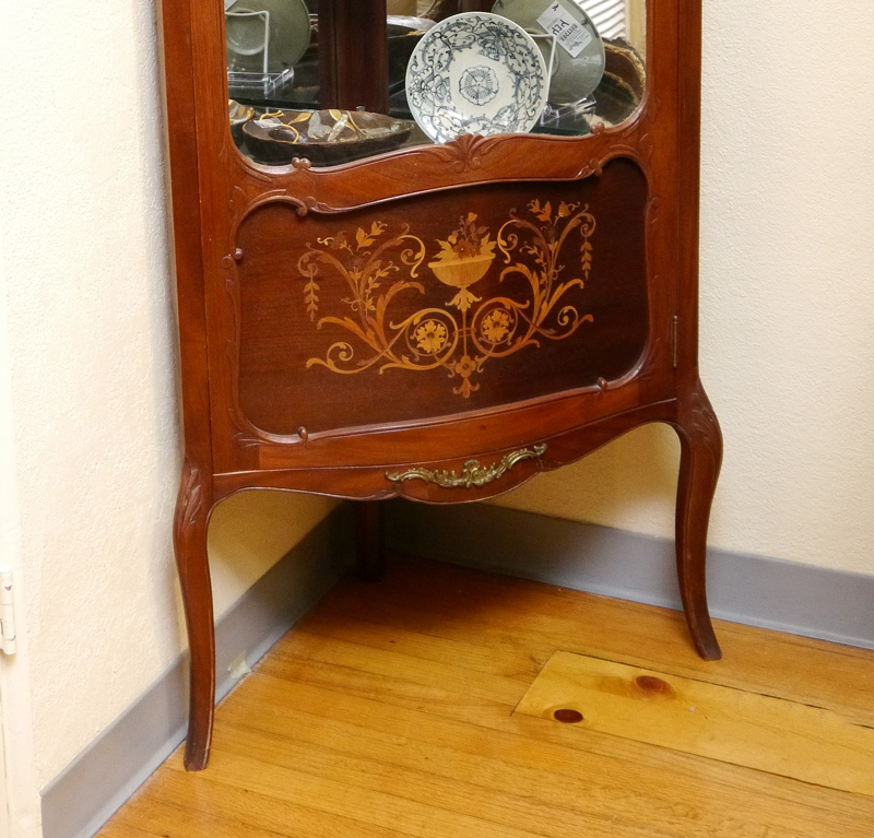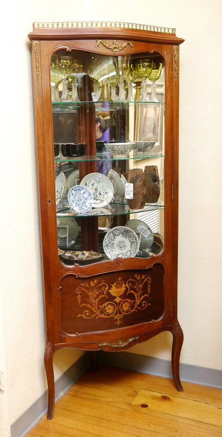 ORMOLU MAHOGANY INLAID FRENCH CORNER CURIO CABINET: Serpentine front with ormolu gallery and mounts. Curved glass front with 3 glass shelves, lower section of door with urn and floral motif inlay. Overall 69 1/2'' h. x 29''(front width) x 16 1/2''deep. Approx 22'' each back side.