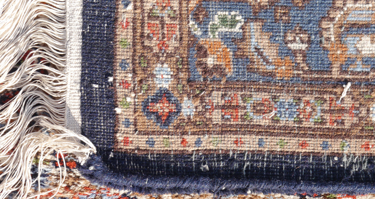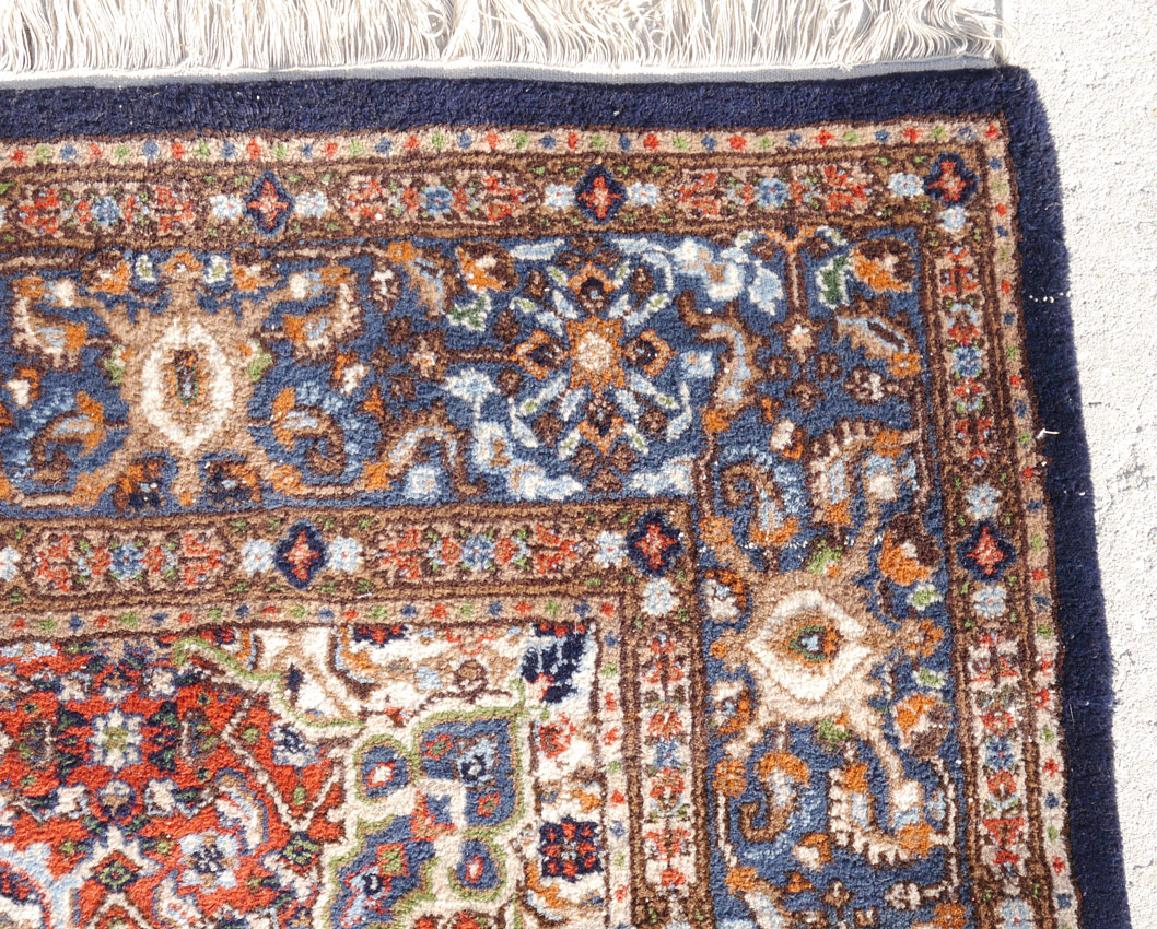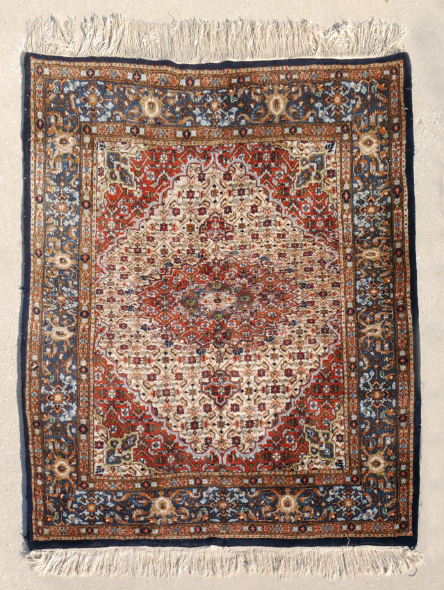 MODERN INDO-PERSIAN HAND KNOTTED WOOL RUG, 5' x 6' 6'': This squarish size rug has a rust colored central medallion and corners of the field of the rug. The main field of the rug has an ivory ground with an overall lattice design. The main border of the rug has various shades of blue, rust and ivory and is framed by small rust colored guard borders on either side. The almost square size of the rug makes it more desirable. Condition is good.