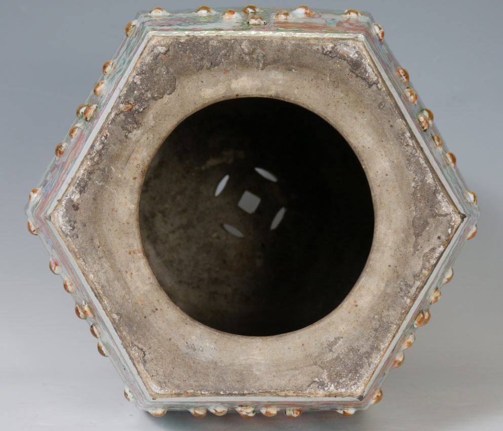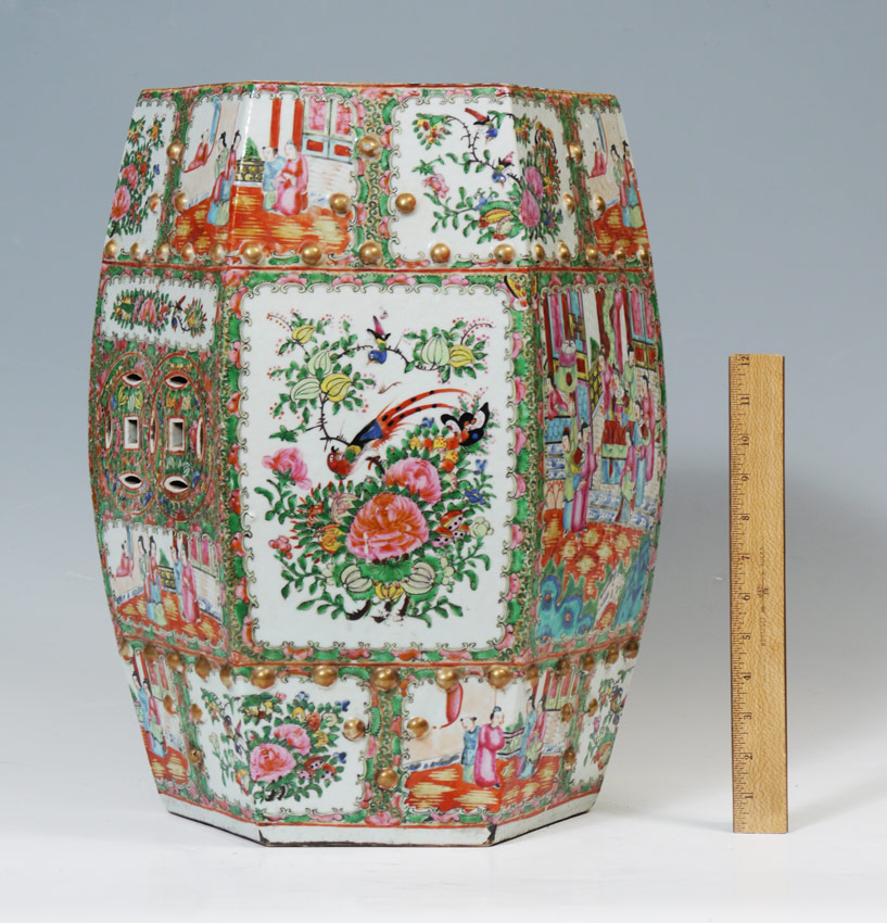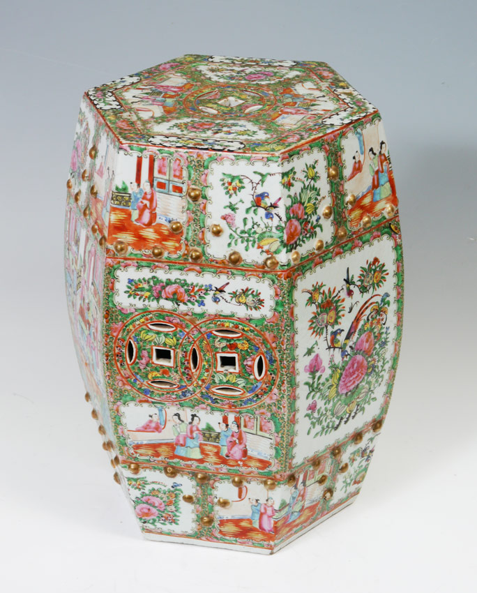 CHINESE ROSE MEDALLION GARDEN SEAT: Hexagon shaped top, 19'' tall x 9'' dia.
