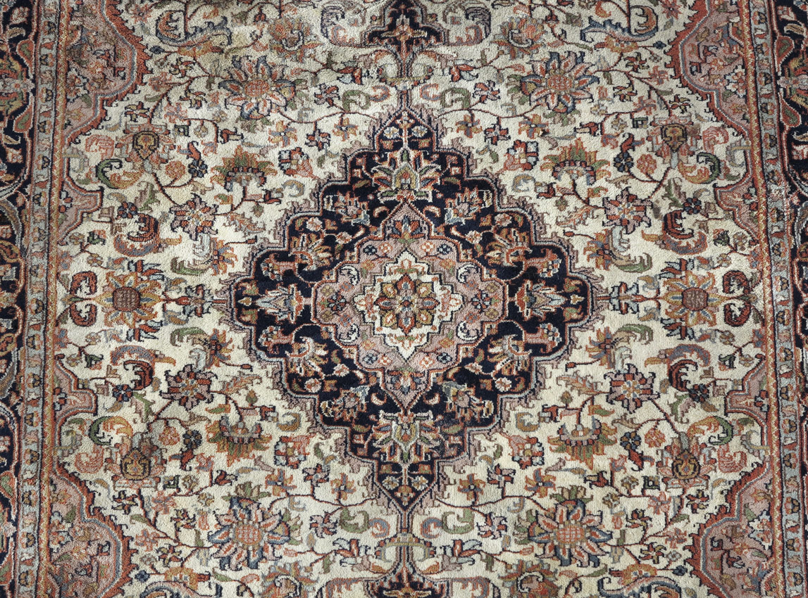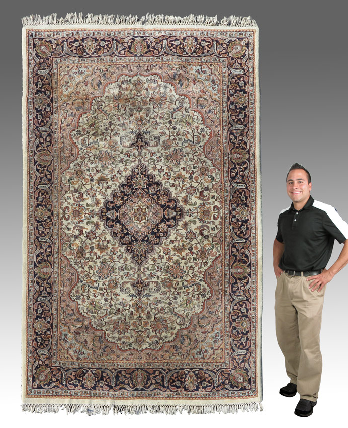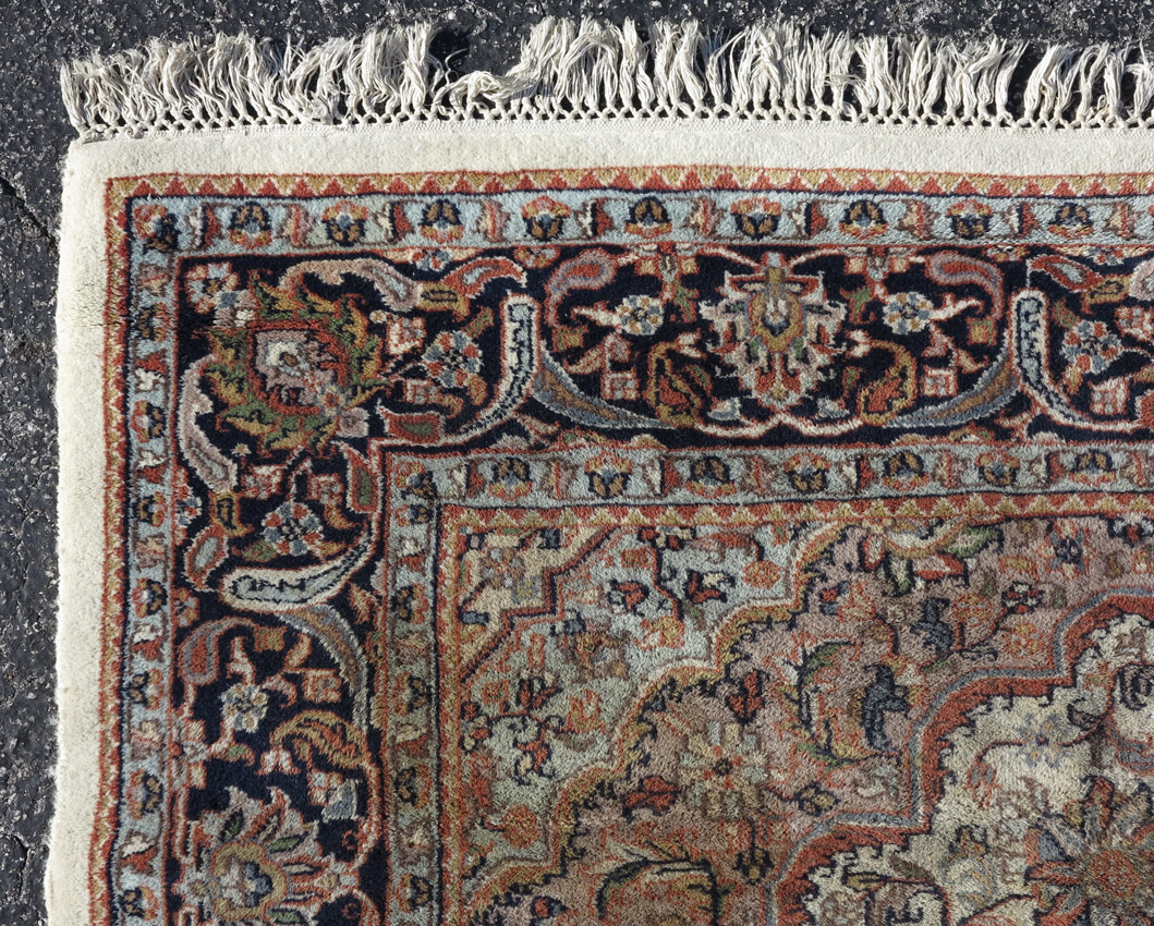 MODERN INDO-PERSIAN HAND KNOTTED WOOL RUG, 6' 2'' x 9': This nice sized rug has a light colored field, ivory in the center and beige in the corners with a deep blue diamond shaped medallion in the center of the rug. Over all the field are vines that connect flowers and leaves done in colors of pale green, beige, blue, rust, and black. The dark colored ground of the main border matches the colors of the medallion and nicely frame the rest of the rug.