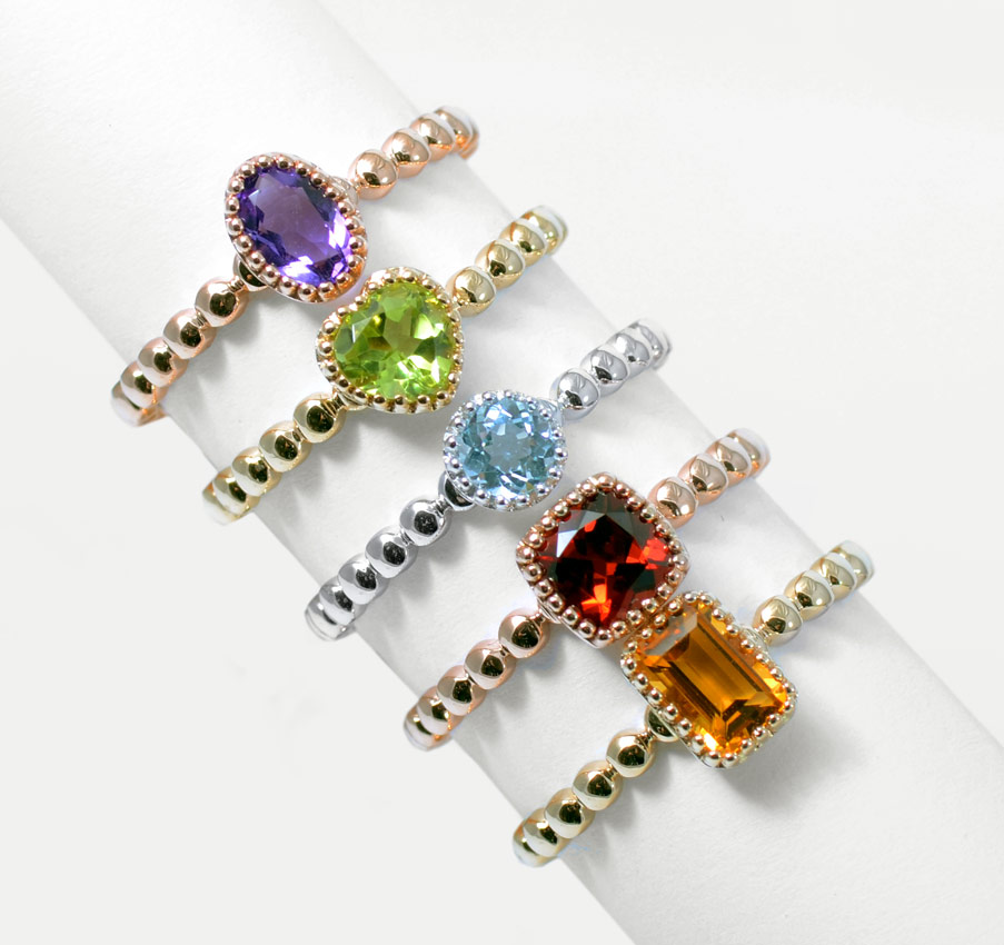 5 GEMSTONE STACKING RINGS: 14K white, yellow and rose gold rings contain gemstones including citrine, garnet, blue topaz, amethyst and peridot. The gemstones are bezel set. Weight: 8.0 grams.
