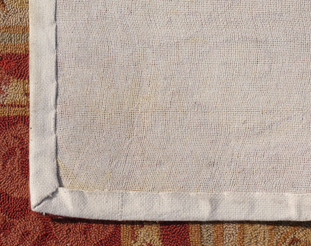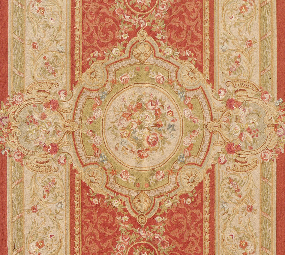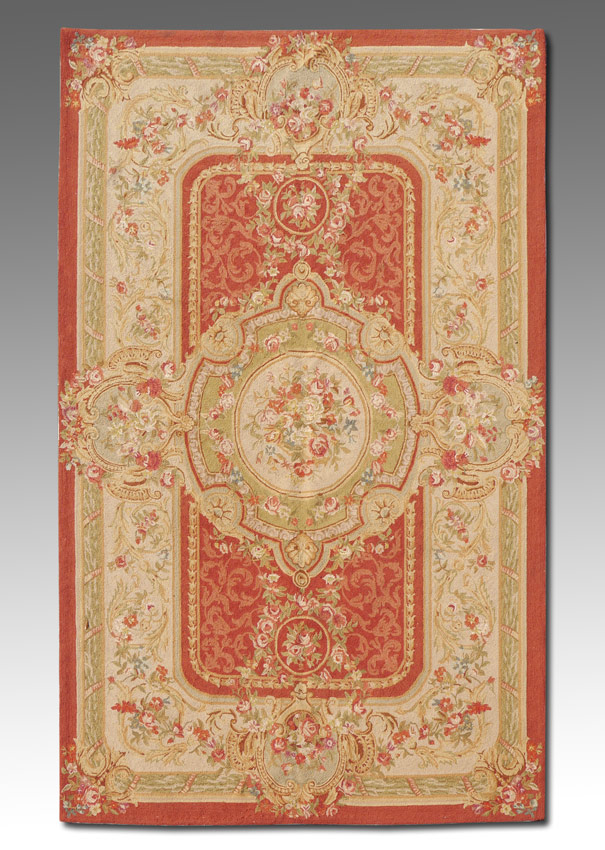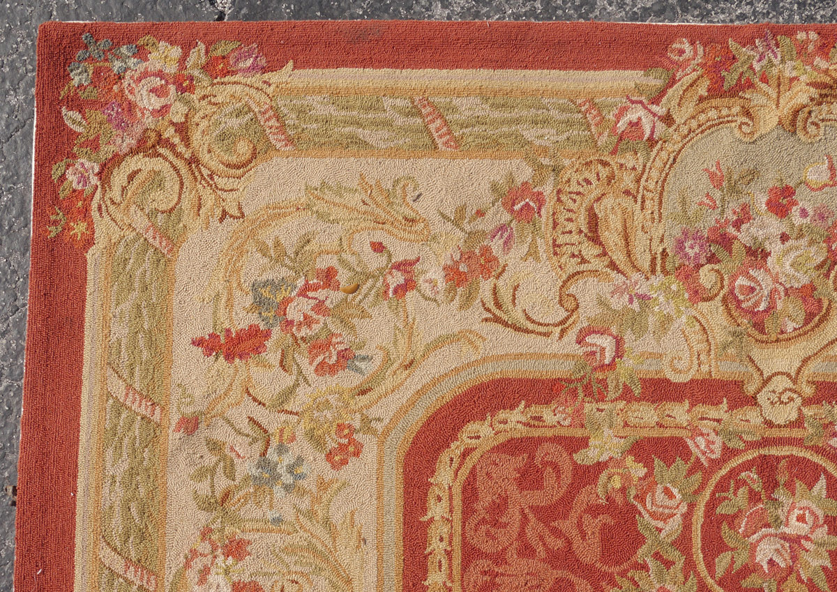 MODERN CHINESE HAND HOOKED WOOL RUG, 5' 6'' x 8' 5'': This hand hooked rug has a French Aubusson design and was made using a lovely color palette that includes pale green, a soft red, a peachy red, beige, ivory, and brown. The rounded central medallion goes into the border of the rug on the sides and the ends with sprays of flowers or smaller medallions. This broken border pulls the whole rug together and makes for an attractive piece of art that you can walk on. Condition is good.