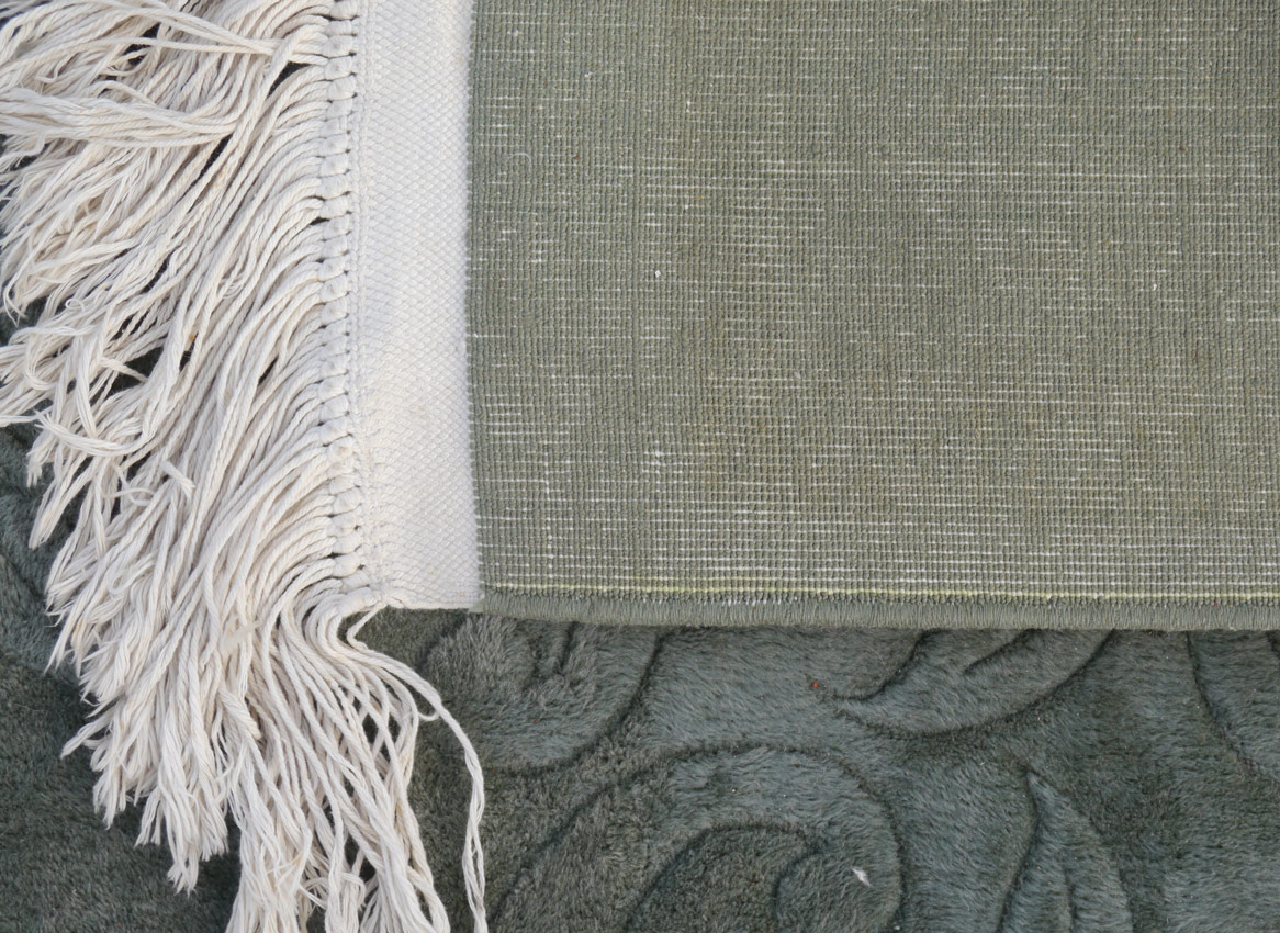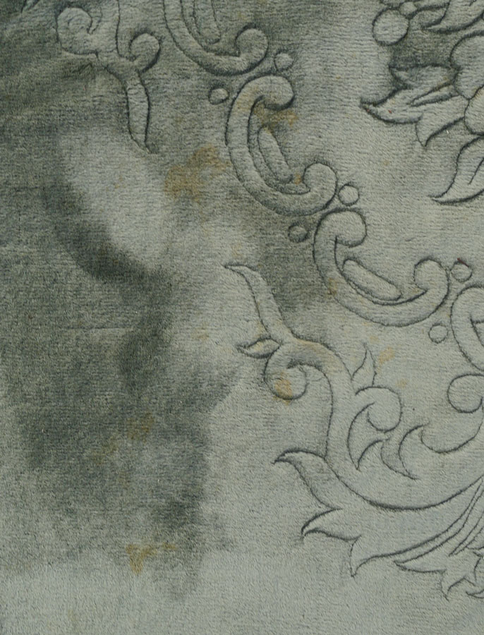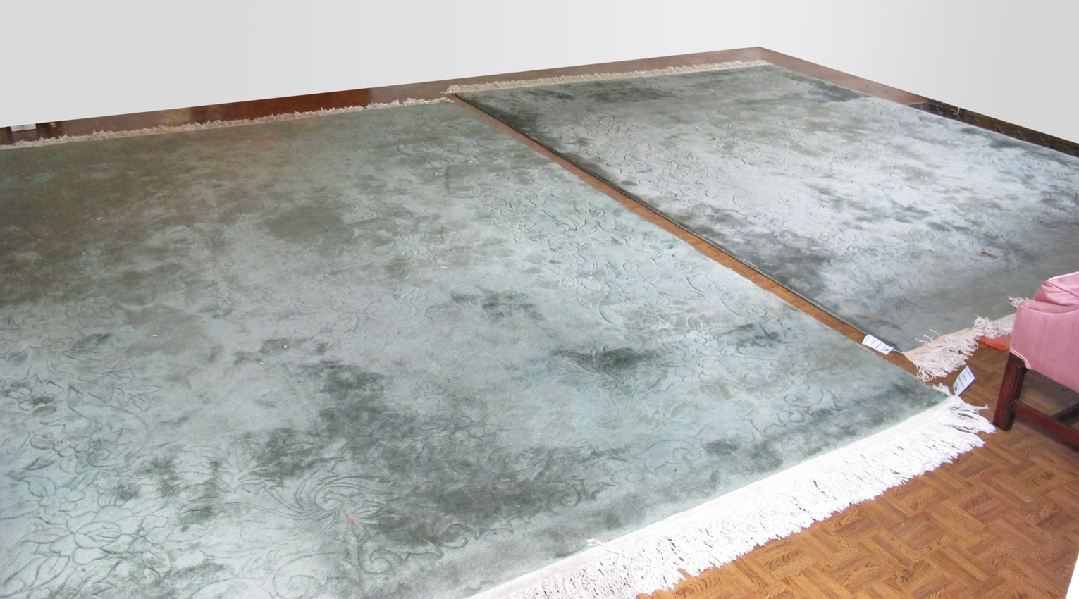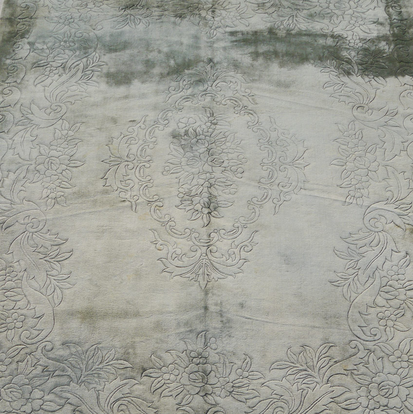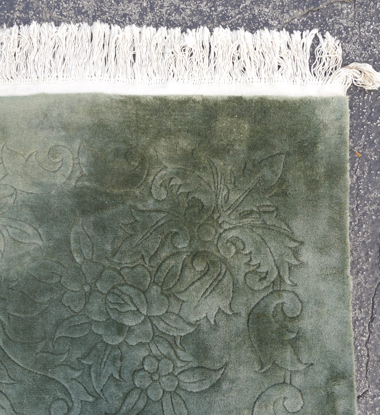 MATCHED PAIR OF SEMI-ANTIQUE CHINESE NICHOLS HAND KNOTTED WOOL RUG, 9' 1 '' x 12' 5'': Theses Chinese rugs are beautiful solid pale green carpets whose design motif consists of carved, sculptured flowers and leaves around the outside of the field and the same forming a large central medallion. The rugs' pile has a lustrous sheen that adds to the look of the rugs. The simplicity of the design added to the solid color makes these rugs that could fit in to any decor.