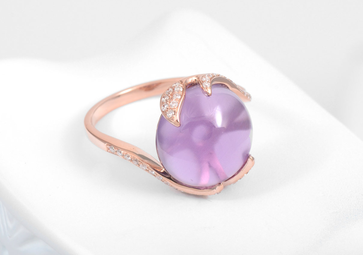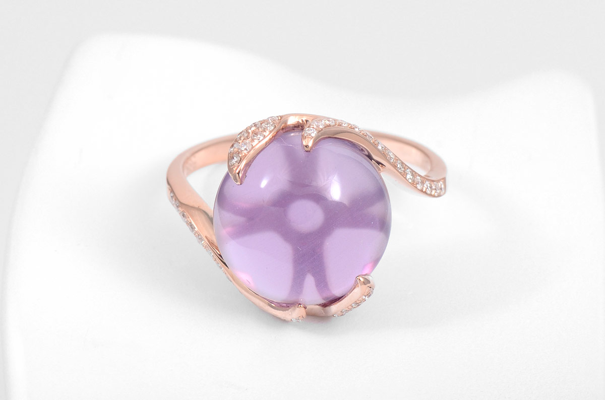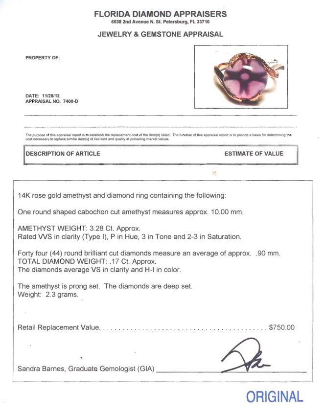 ROSE GOLD AMETHYST & DIAMOND RING: 14K rose gold ring centers an approx. 3.28 Ct cabochon cut amethyst, 10mm, VVS clarity. The graceful curves of the prongs contain 44 round brilliant deep set diamonds totaling approx. .17 Ct., VS in clarity. Size 6.5. Weight 2.3 grams. Sold with current Florida Diamond Appraisers GIA graduates appraisal for $750.