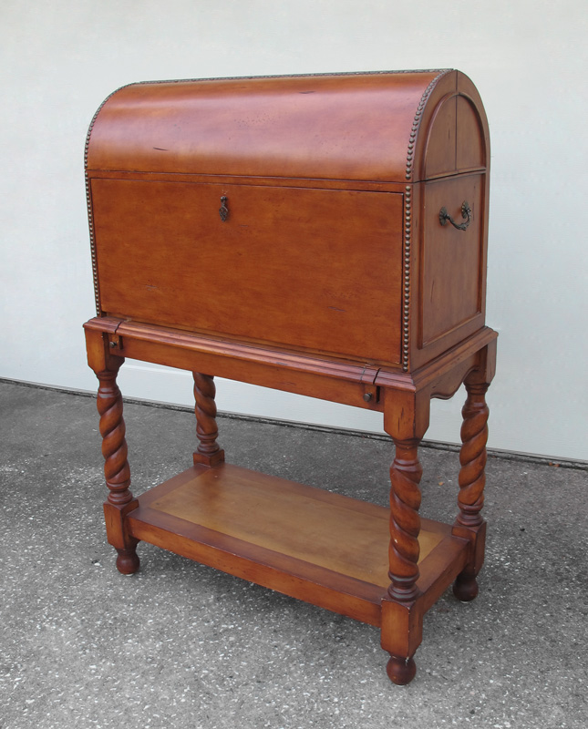 LEXINGTON FURNITURE DOME TOP BAR: Contemporary bar with tacked applied decoration, hinged domed top over fall front door. Barley twist legs and lower shelf. 53'' h. x 36 1/2'' x 18''.