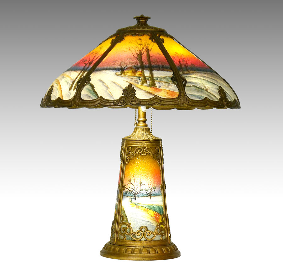 REVERSE PAINTED LIGHTHOUSE BASE LAMP: Reverse painted lighthouse base with gilt metal overlay. 6 panel reverse painted bent glass shade with matching gilt metal frame. All glass with chipped ice exterior. Base measures 22'' h. x 7 1/2'', shade 7 1/4'' h. x 18 1/2''.