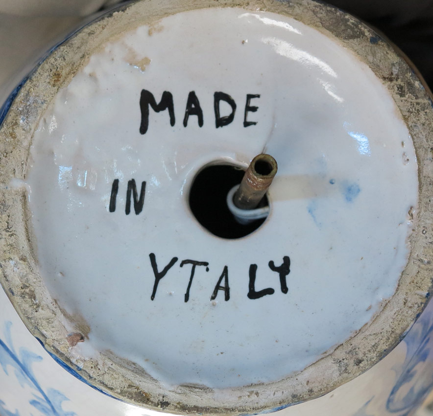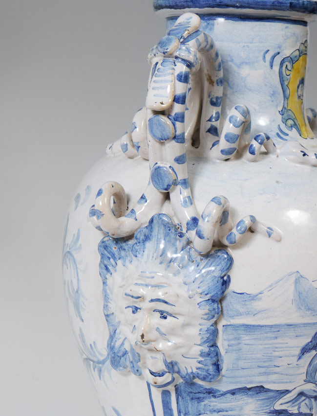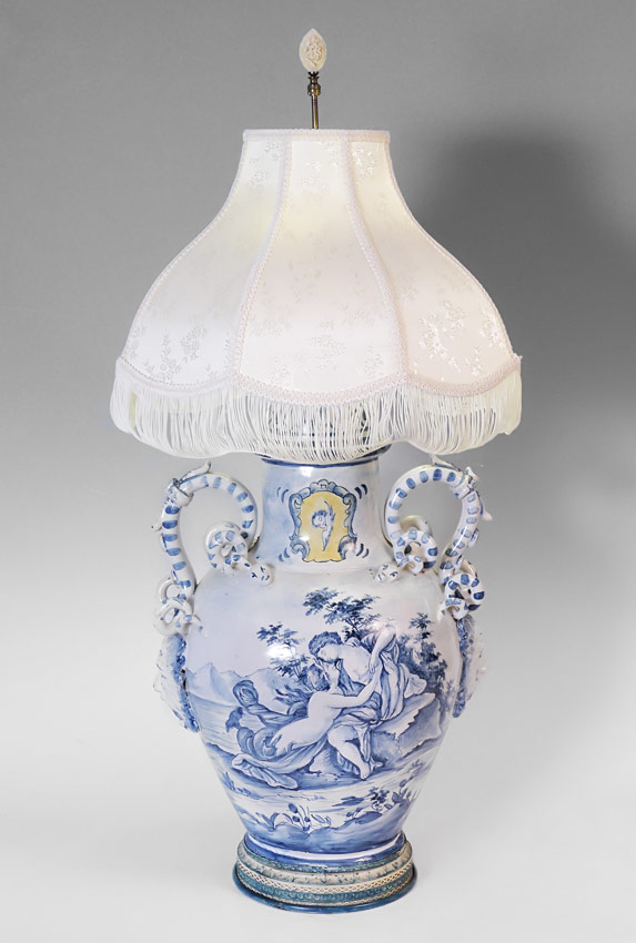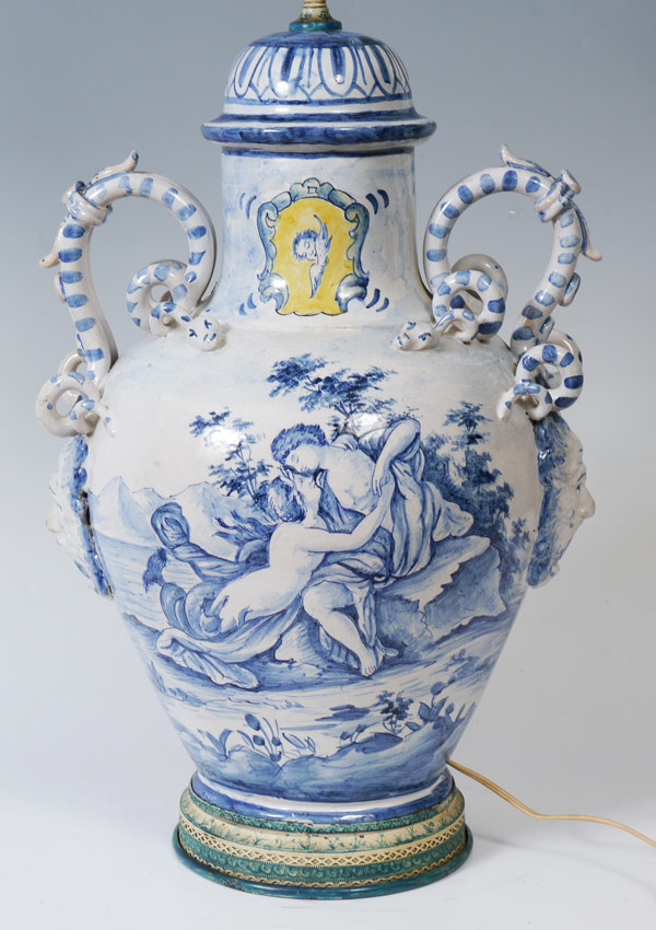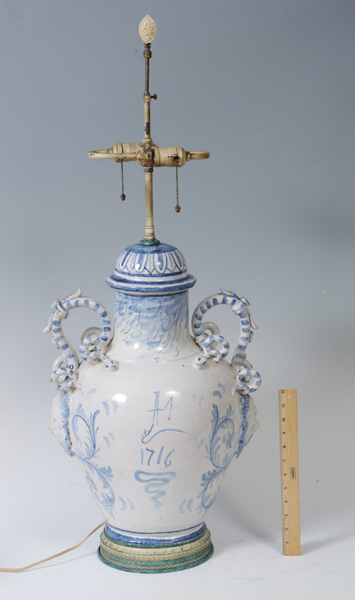 IMPRESSIVE ITALIAN FAIENCE SERPENT HANDLE DELFT STYLE LAMP: A large blue and white decorated Italian lamp in the Delft style with figural snake handles above masquerons. Front outdoor genre scene featuring lovers, date of 1716 verso, most likely 20th century production. Marked Made in Italy on base. Affixed to embossed metal base. Overall 35'' h. x 15''. Sold with fringed shade 10 3/4'' h. x 17 11/4''.