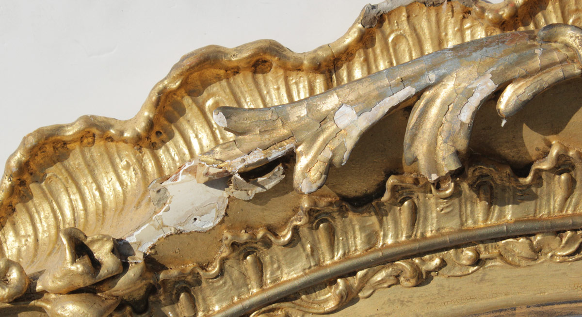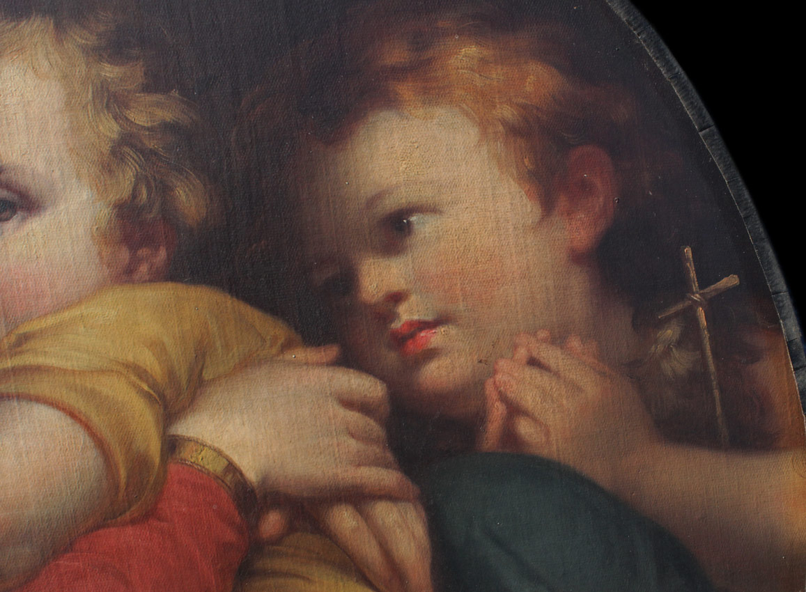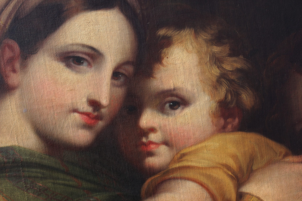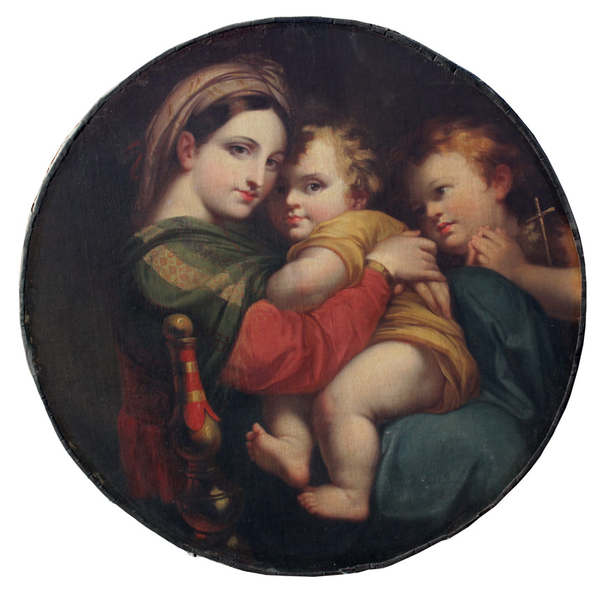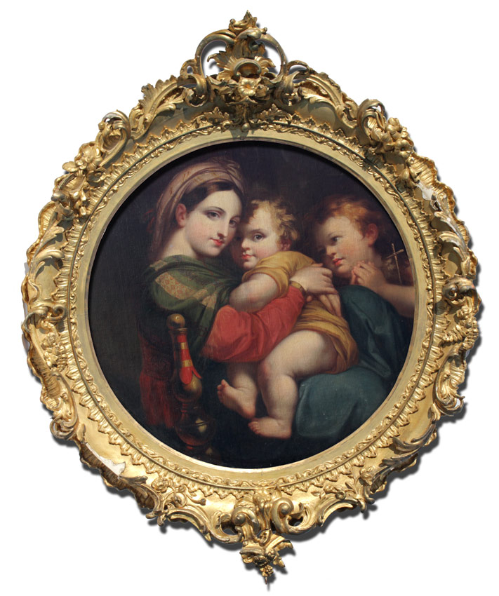 EARLY LARGE PAINTING AFTER RAPHEL MADONNA DE LA SEDDIA: Oil/Canvas laid down on wood, after the antique, an exceptional 19th Century copy of the master work, circular 31 1/4'' in diameter, no visible signature, encased in show stopping, 19th, possibly 18th Century, gilded and pierced carved Italian gesso frame with wear, repair and in need of further restoration, 55'' x 43 1/2'' x 7'' deep.