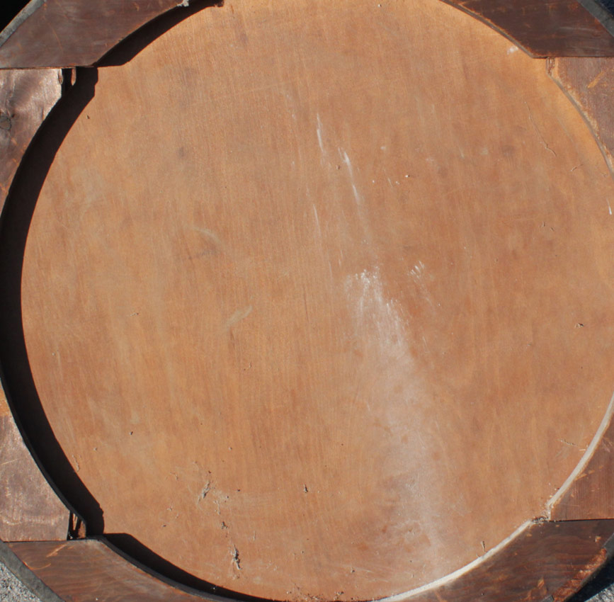 CONDITION: Laid down on wood, several minor areas of repairs, several abrasions with minor paint loss, needs cleaning, but good overall condition.
