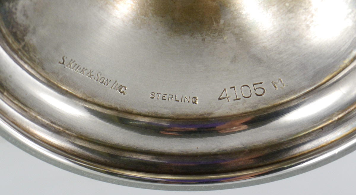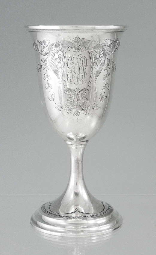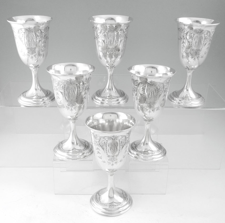 6 KIRK & SONS STERLING GOBLETS: Each engraved with foliate decoration. Monogrammed. 6 3/4'' h. x 3 1/2''. Approx. 34.3 Troy oz.