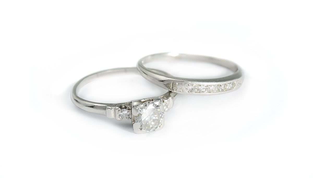 PLATINUM .88 CTW DIAMOND BRIDAL SET: Platinum engagement ring and band centering an approx. .63 Ct round brilliant cut diamond. Rated VS2 in clarity and H in color. 7 round single cut diamonds totaling approx. .25 Ct. Rated VS in clarity and G-H in color. Total weight: .88 Ct. Approx. The Center diamond is prong set. The small diamonds are channel set. Size 7. Weight: 5.9 grams.