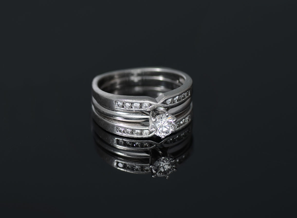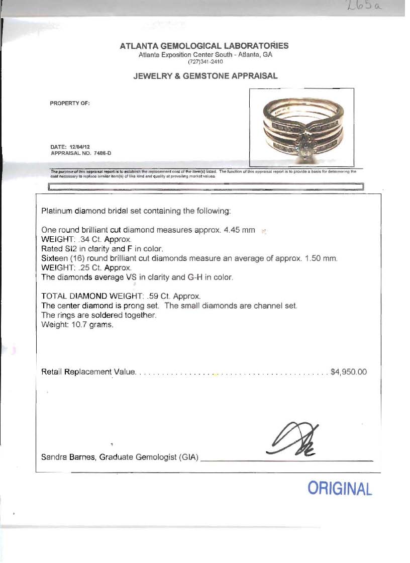 PLATINUM DIAMOND BRIDAL RING: Engagement ring and jacket are soldered as one ring. The central solitaire diamond being approx. .34 Ct., round brilliant cut, SI2 in clarity, G-H color. The additional 16 channel set round brilliant diamonds the band total .25 Ct., average VS in clarity and G-H color. Size 5.5. Weight 10.7 grams. Sold with current Atlanta Gemological GIA graduates appraisal for $4,950.