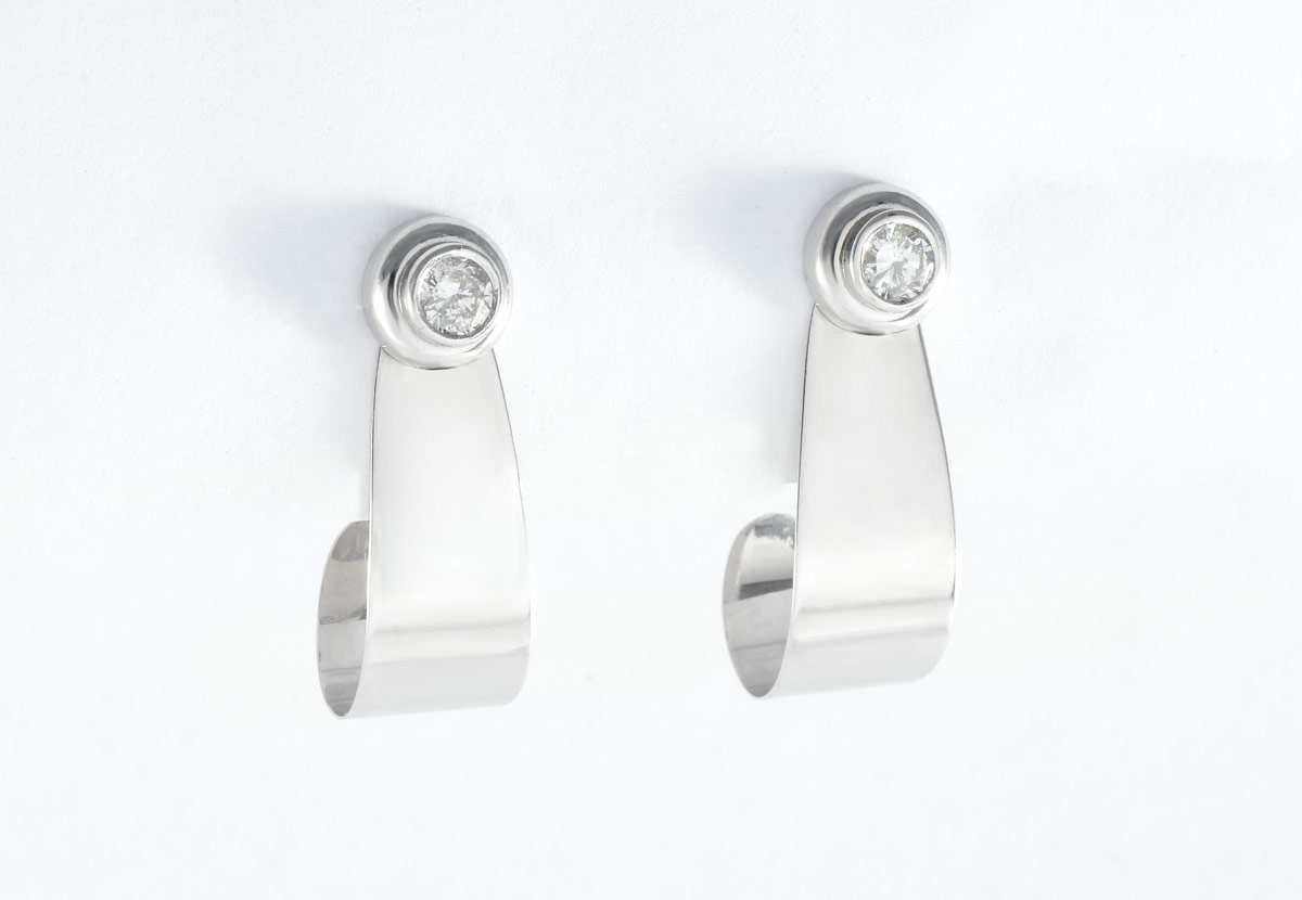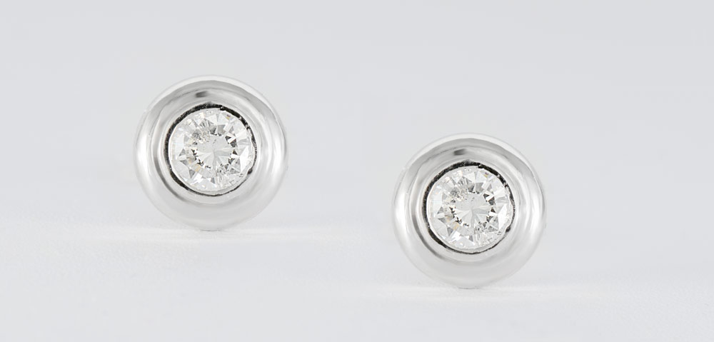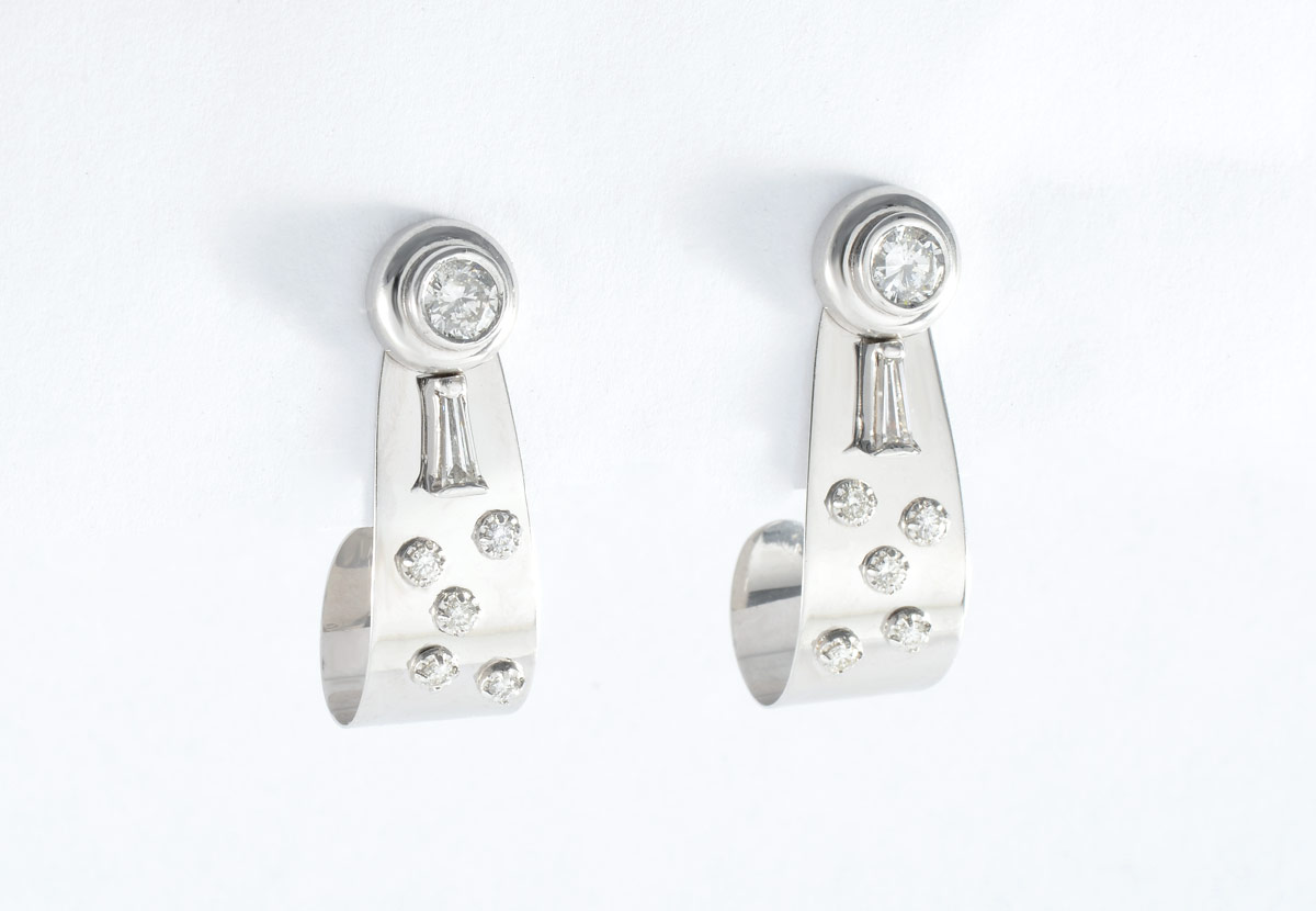 DIAMOND STUD EARRINGS & JACKETS: 14K white gold solitaire earrings contains 2 round brilliant cut diamonds totaling approx. .60 Ct. Rated SI2-I1 in clarity and G-H in color. Two pairs, one with diamonds, of 14K jackets. 10 round brilliant cut diamonds and 2 baguette cut diamonds total approx. .35 ct. GOld weight. Weight: 6.8 grams. Sold with current Florida Diamond Appraisers GIA graduates appraisal for $3.350.