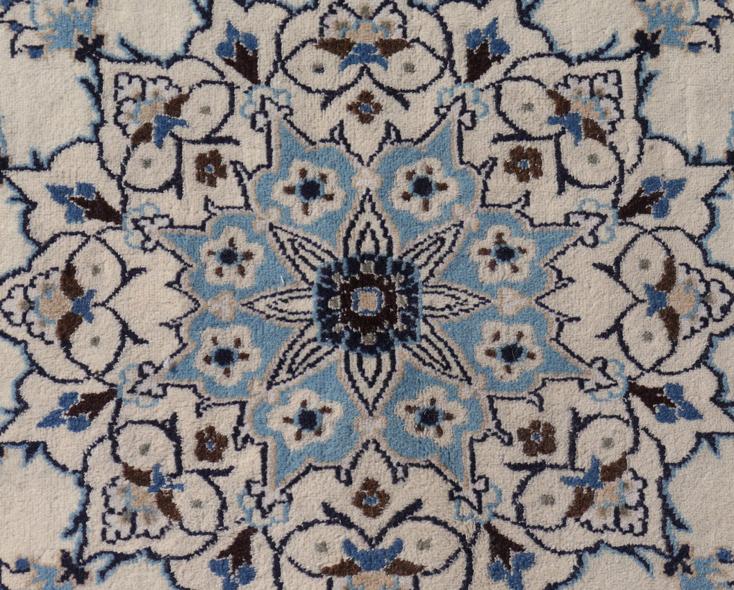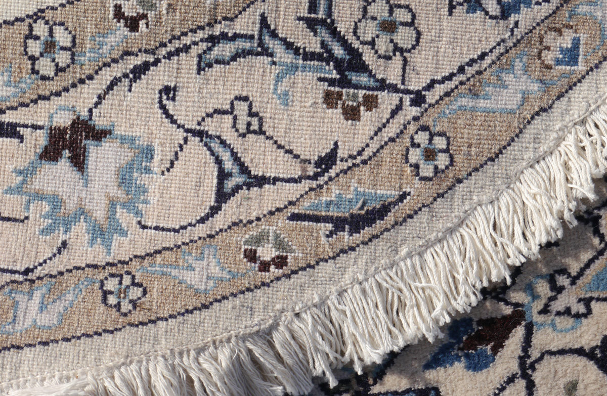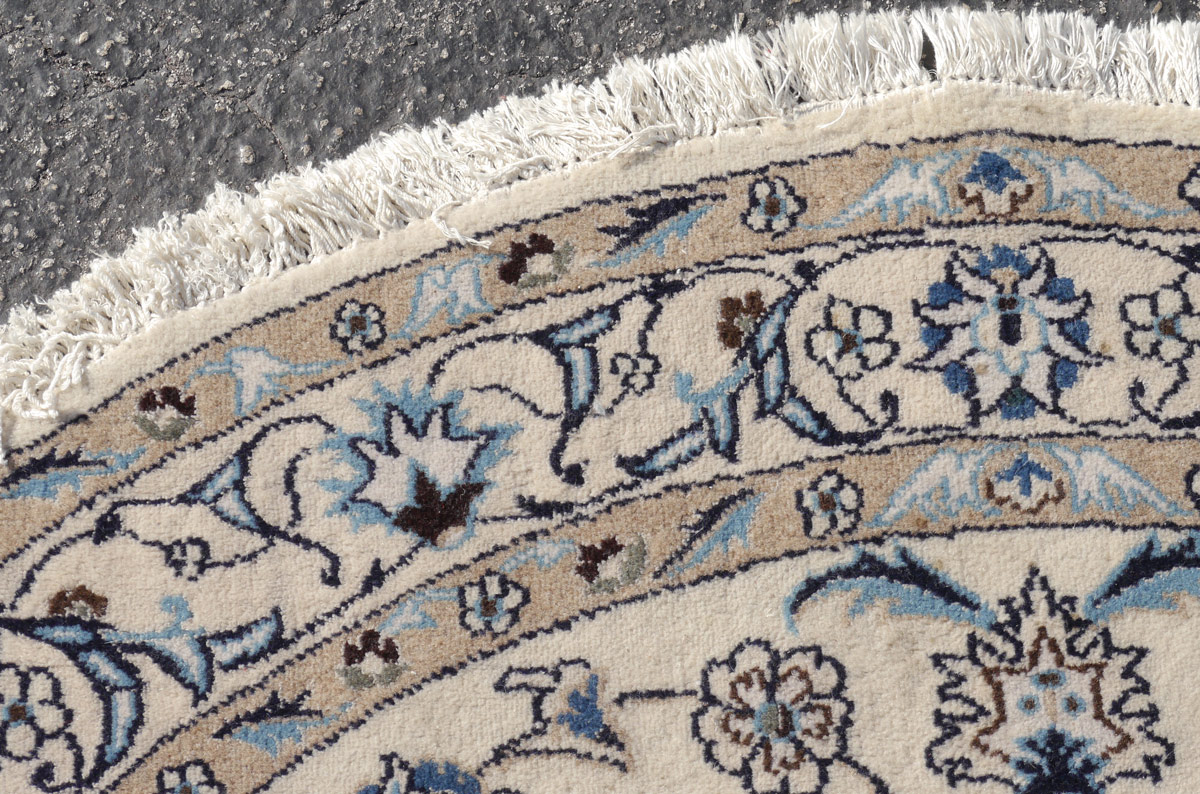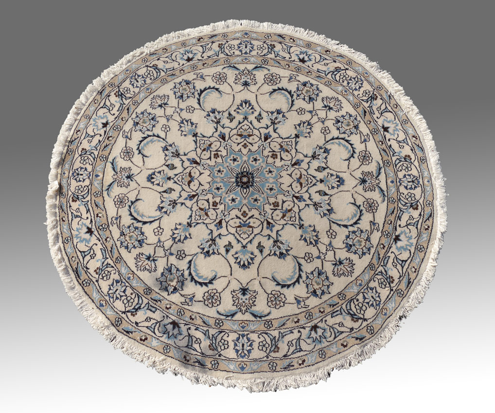 MODERN ROMANIAN HAND KNOTTED WOOL RUG, 58 1/2'' ROUND: This pretty round rug has a light palette with a white field covered with a design in colors of grey and shades of blue that radiates out from the center to the border of the rug. Round rugs are not easy to weave and don't always have an even design, but this one is well done. This would look good in an entryway of your home.
