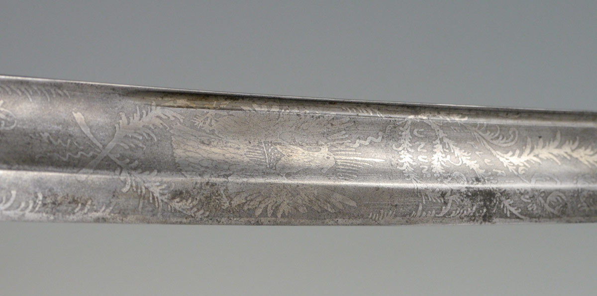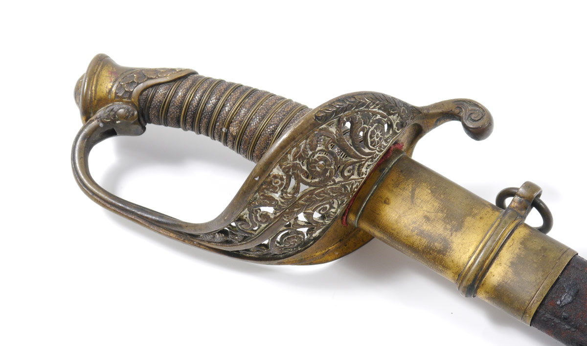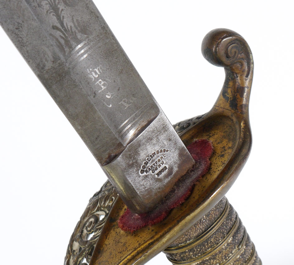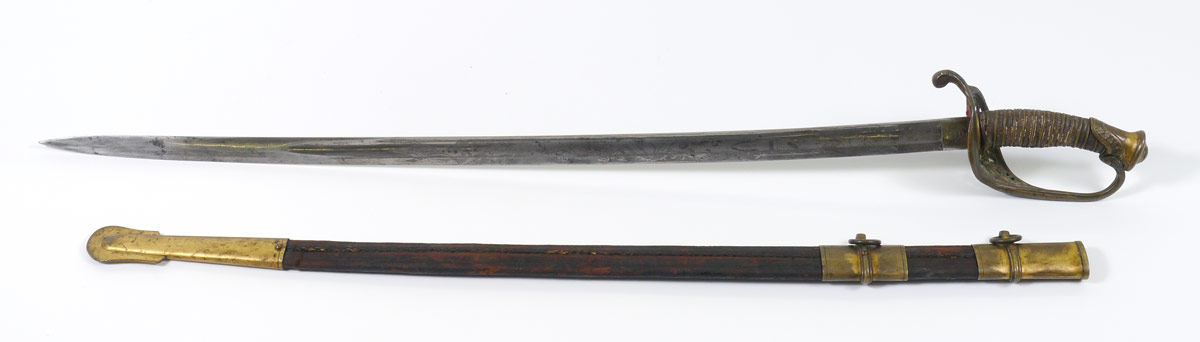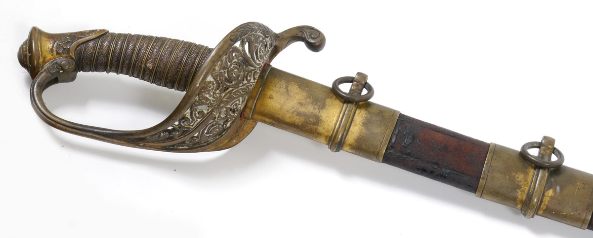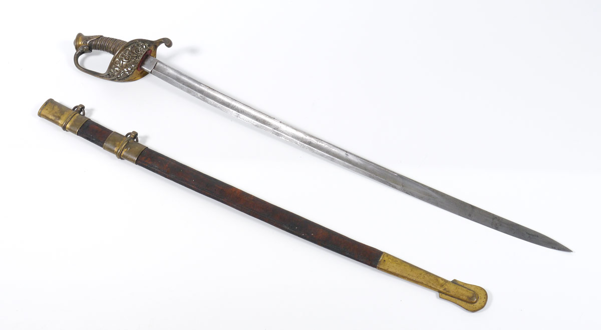1862 MODEL 1850 COLLINS FOOT OFFICERS SWORD: Presentation quality Model 1850 foot officers sword manufactured by Collins & Co., Hartford and dated 1862, no inspector marks. Retailed by G.W. Simons Brothers, Philadelphia. Brass hilt with extra fancy embellishments on pommel, original rayskin wrap and wire. 31'' blade with etched US, eagle, motto, shield and foliate motifs. Original complete leather scabbard with brass mounts. Overall 38'' long.