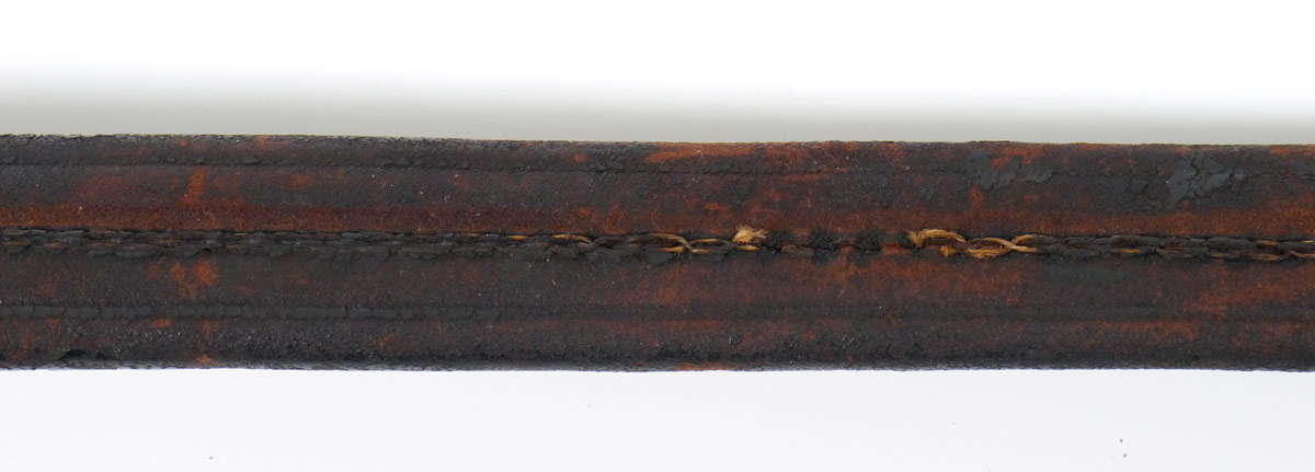 CONDITION: Spots of age discoloration and missing very tip of blade, flaking and loss of leather to scabbard, break to stitching. Loss of gilt to scabbard mounts, top mount loose. Wear to ray skin on grip.