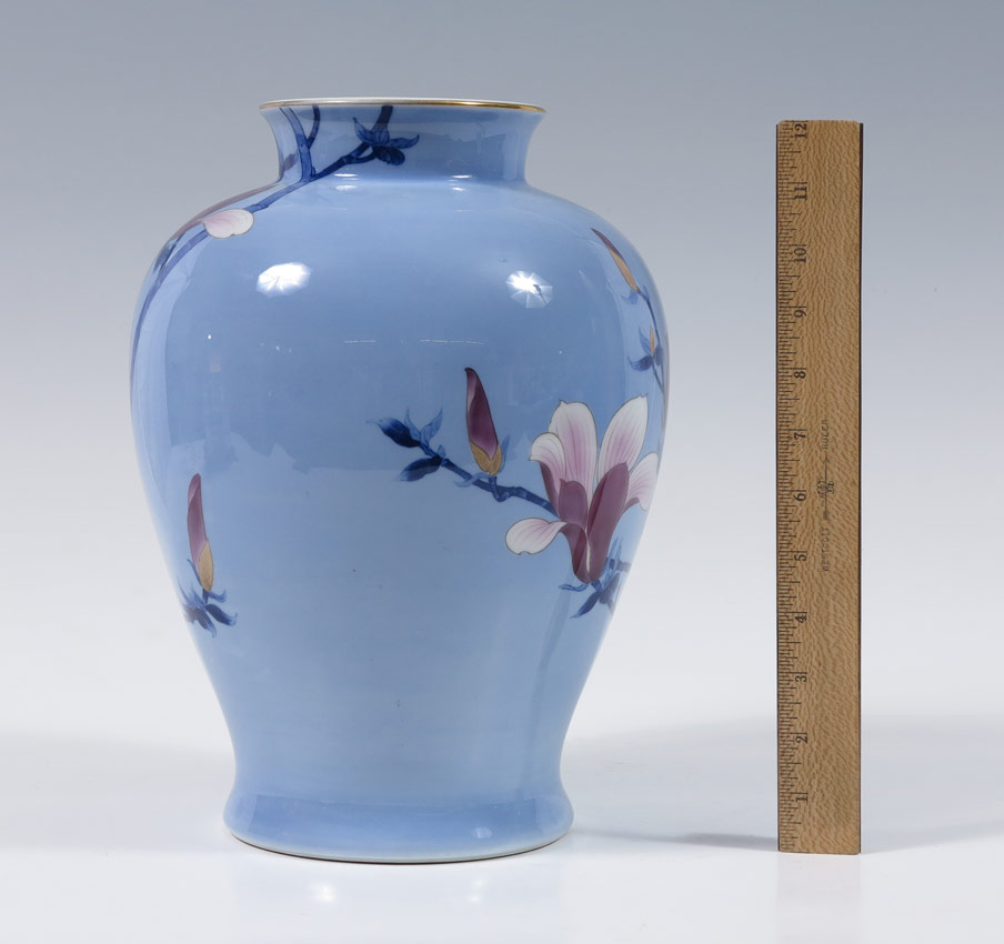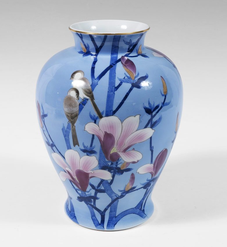 JAPANESE FUKAGAWA VASE: Japanese magnolia and birds motif, signed on base. 12 1/2'' h. x 9'' dia.