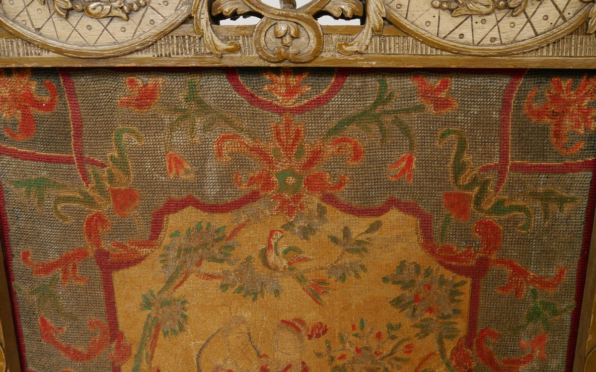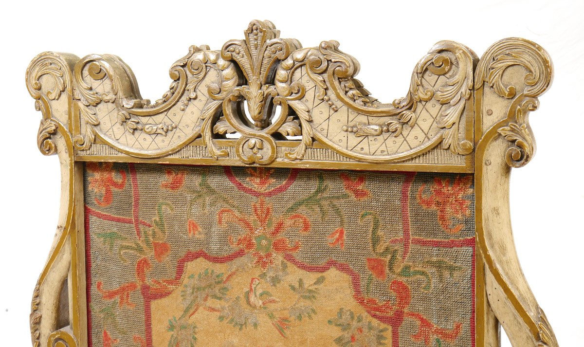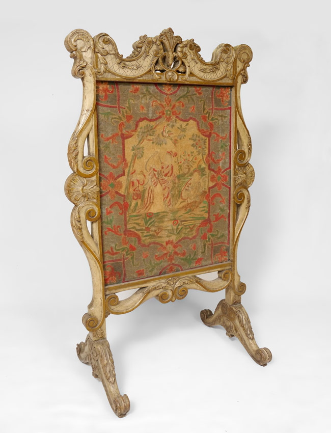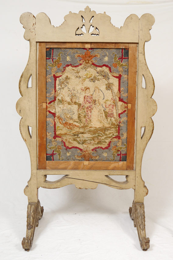 FRENCH CARVED FIRE SCREEN WITH TAPESTRY INSERT: Paint decorated and profusely carved body on carved feet. Removable center section with outdoor genre scene tapestry. 52 3/4'' h. x 32 1/4'' x 18 1/2''.