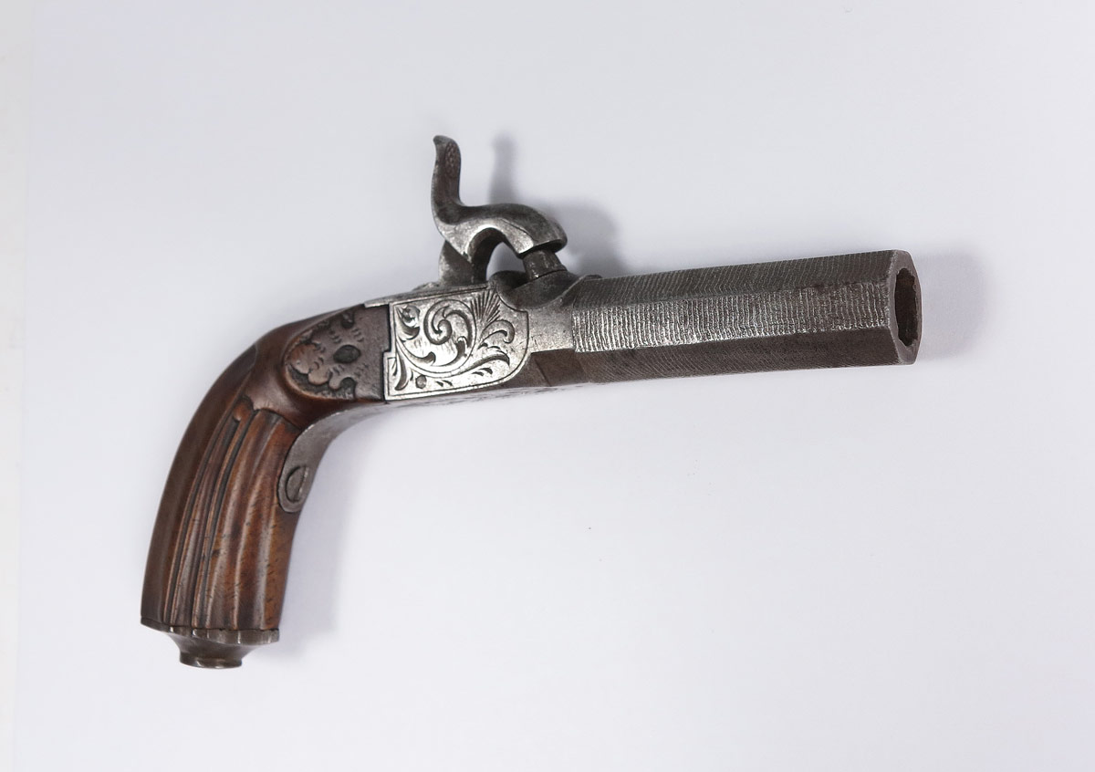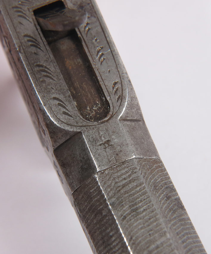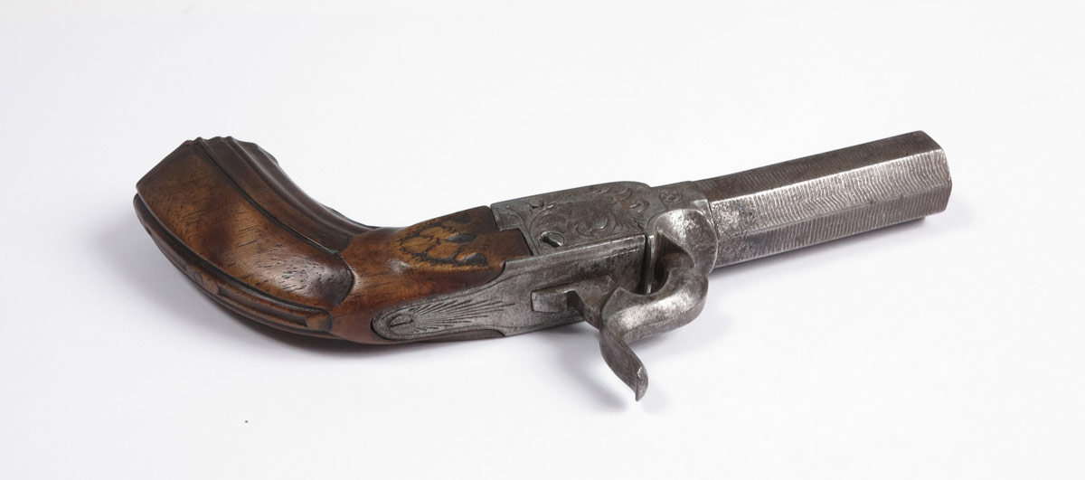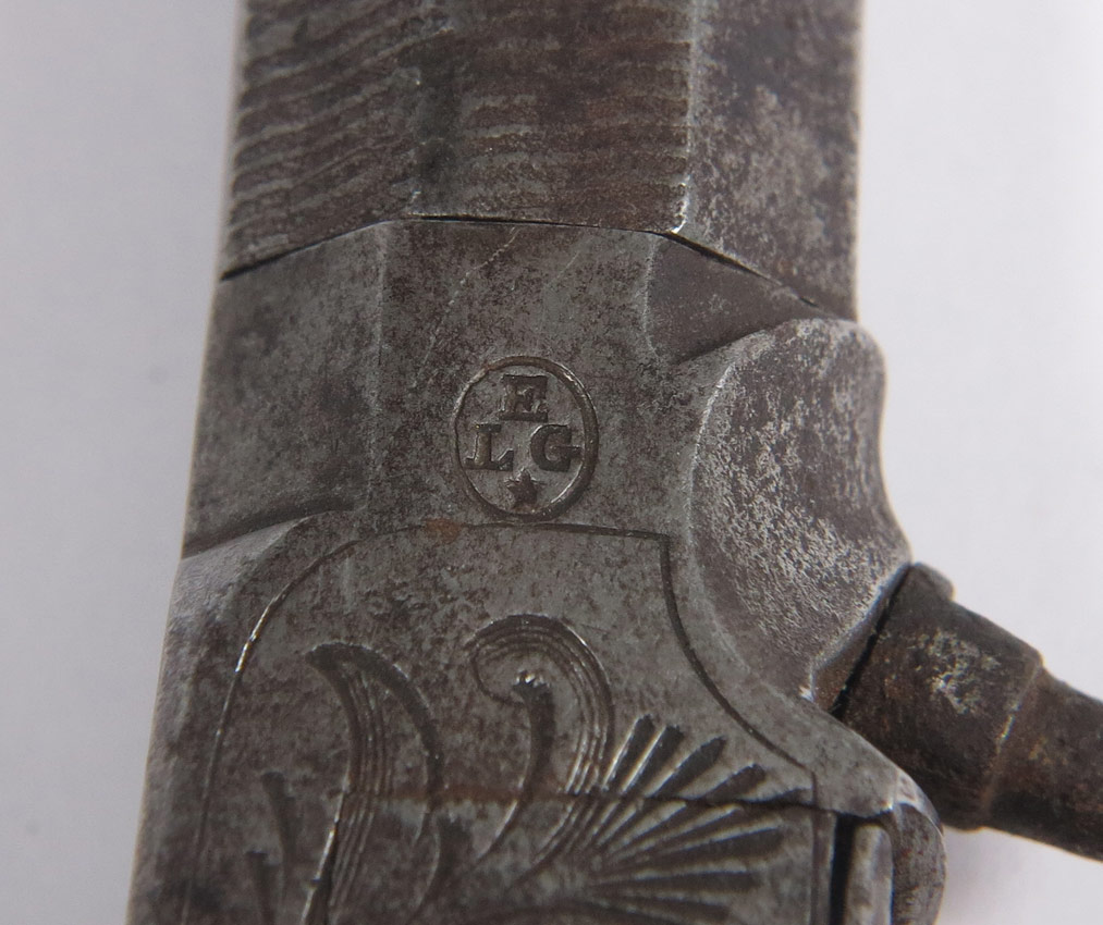 EUROPEAN SINGLE SHOT PERCUSSION PISTOL: Rifled 2'' octagon barrel, engraved frame with Liege markings and center hammer. Carved wood grip. Overall 5 3/4''.