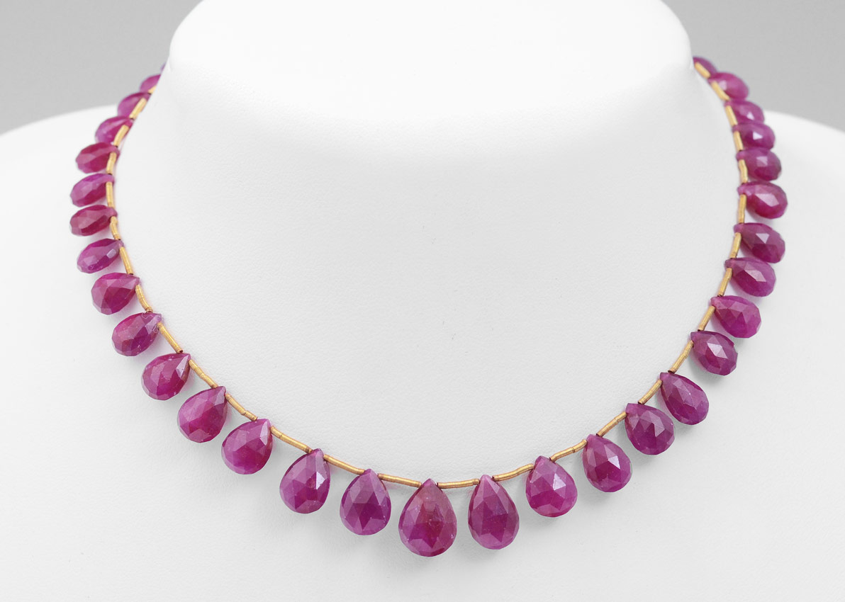 PINK SAPPHIRE NECKLACE: Necklace of 41 drop shaped faceted pink sapphires totaling approx. 88.00 Ct. The sapphires are strung on wire wrapped cord. 14K clasp. Length: 14''