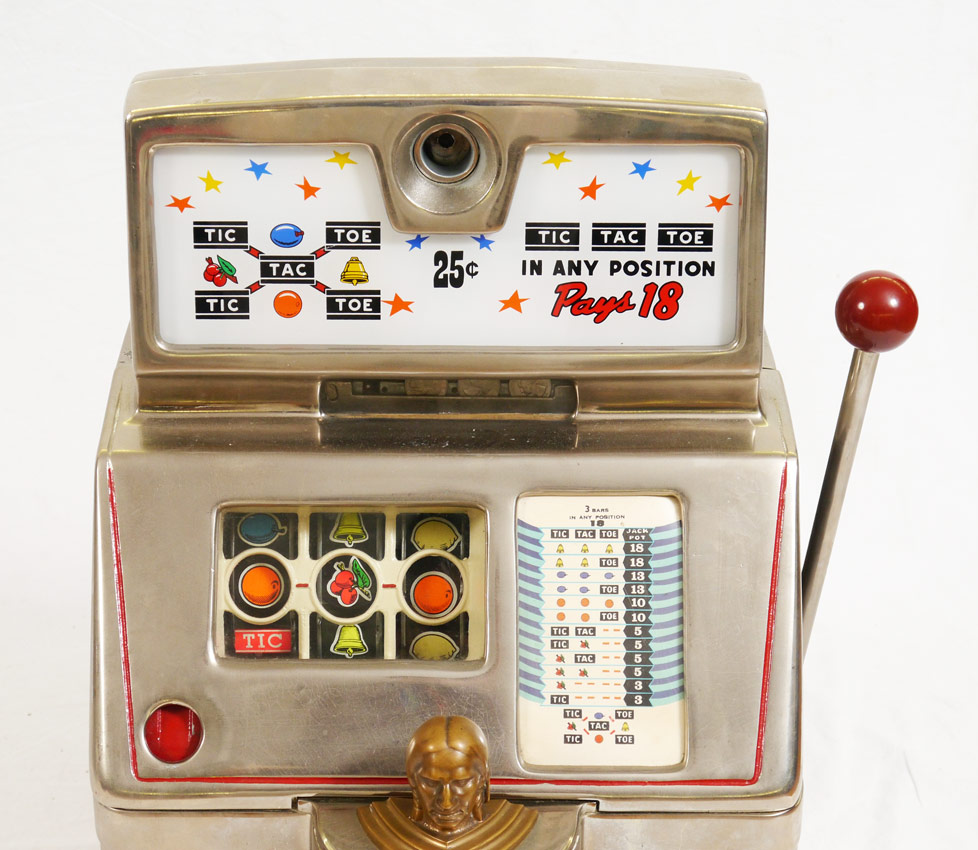 25 CENT JENNINGS CHIEF TIC-TAC-TOE SLOT MACHINE: Mid 20th century by Jennings, 25 cent in original condition. 3 reels, key in office. Red metal louvered panels, oak base. Serial number on key A12430. 27 1/2'' h. x 17'' x 17''.
