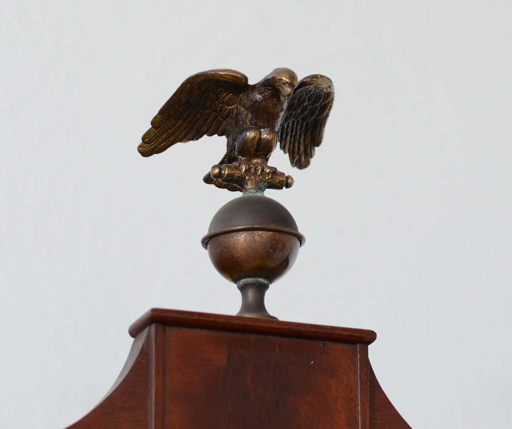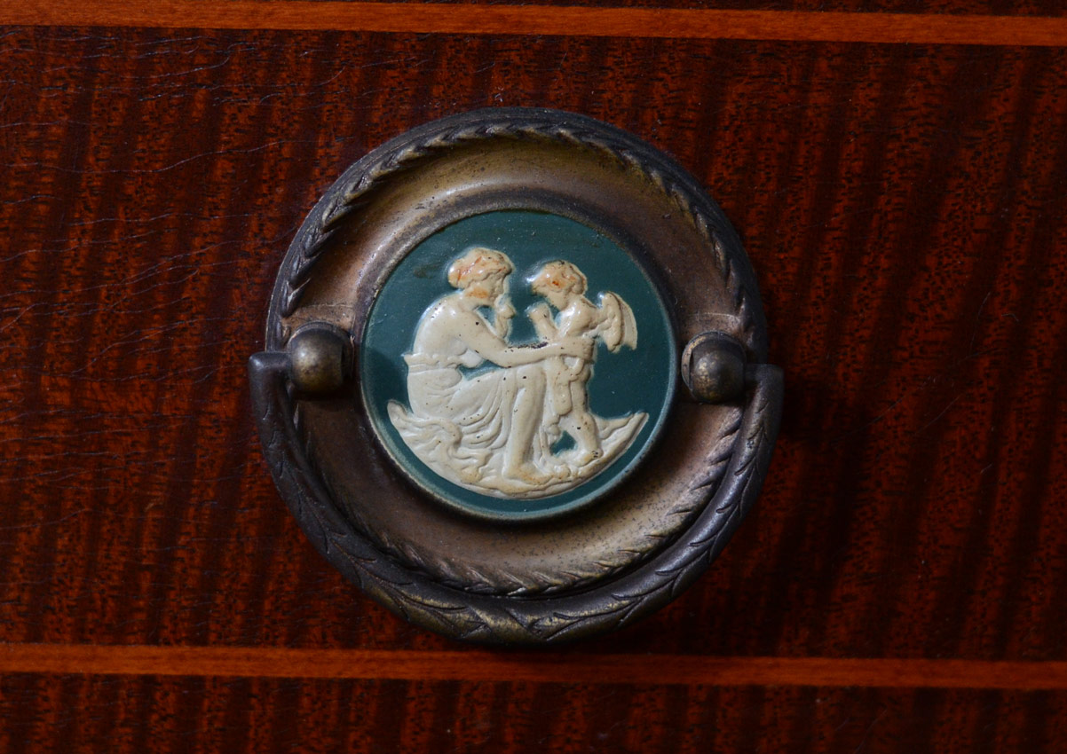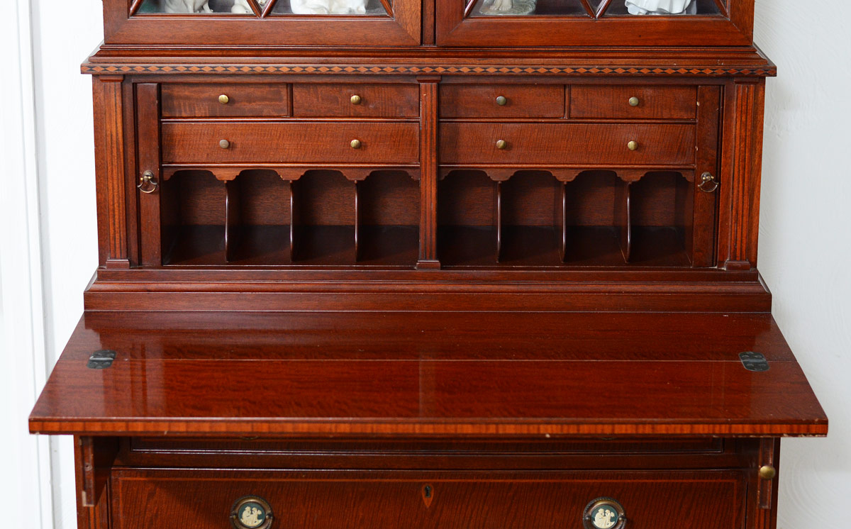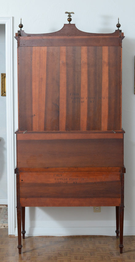 WARSAW FURNITURE MFG CO MAHOGANY INLAID TAMBOUR SECRETARY BOOKCASE: Top section with shaped top, eagle and 2 spire brass finials. Paneled front glass doors with 2 shelves. Base with 2 tambour door fronts which open to 6 drawers and pigeon holes, Over 2 full length drawers with brass pulls having painted cherubic motif central medallions. Parquetry and string inlay throughout base. 83'' h. x 37 1/2'' x 20''. Two part construction, each marked Warsaw Furn Mfg Co Warsaw KY.