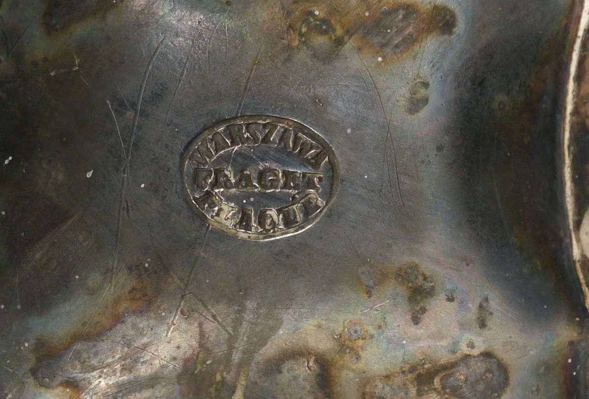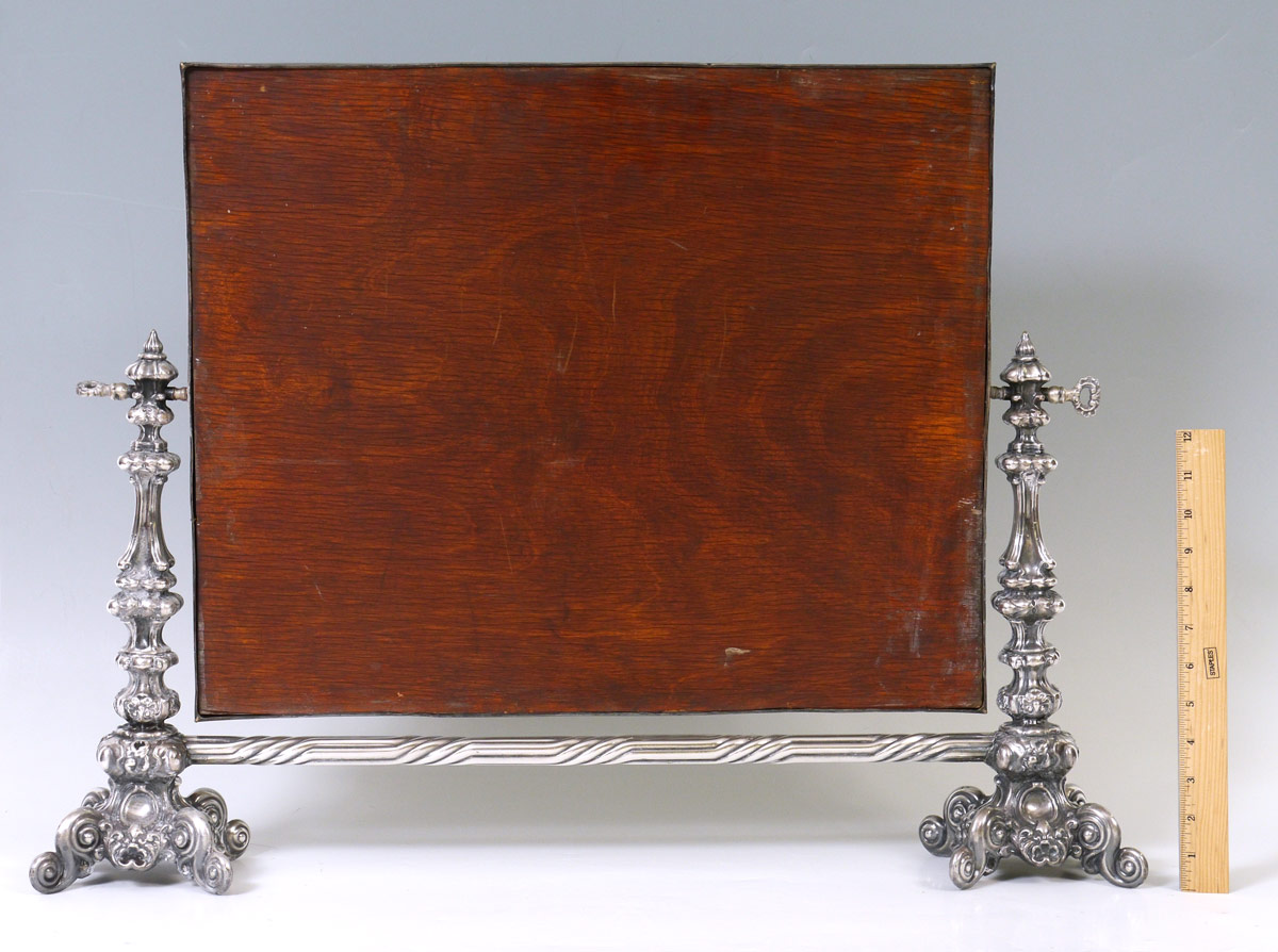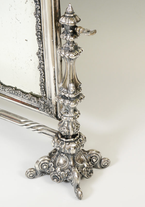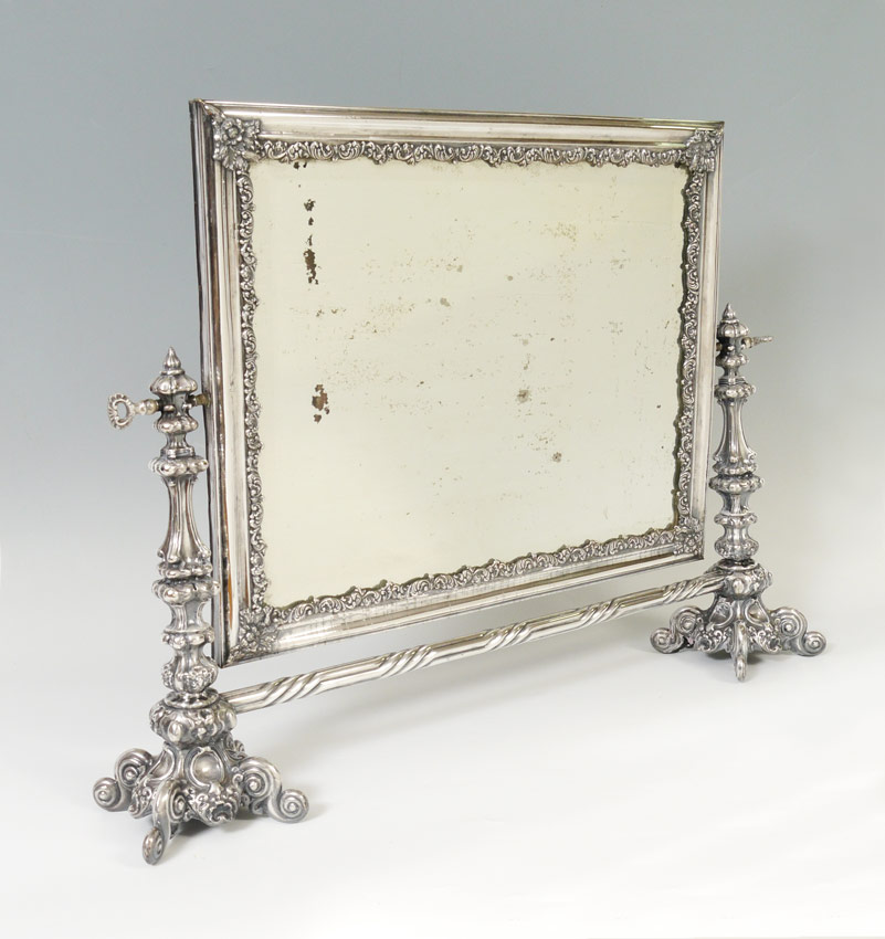 FRAGET POLISH SILVERPLATE TABLE TOP MIRROR: Large mirror on 2 legs, marked ''Warszaiva Fraget Plaque'' base of one foot. Beveled mirror with articulated frame. Overall measures 21 3/4'' h. x 29 1/4'' x 5''.