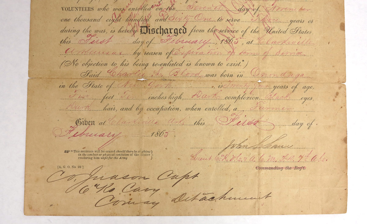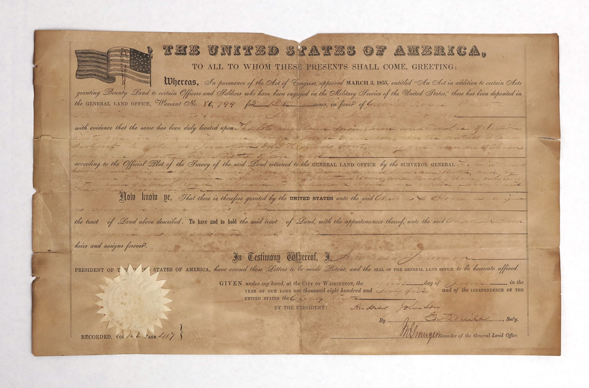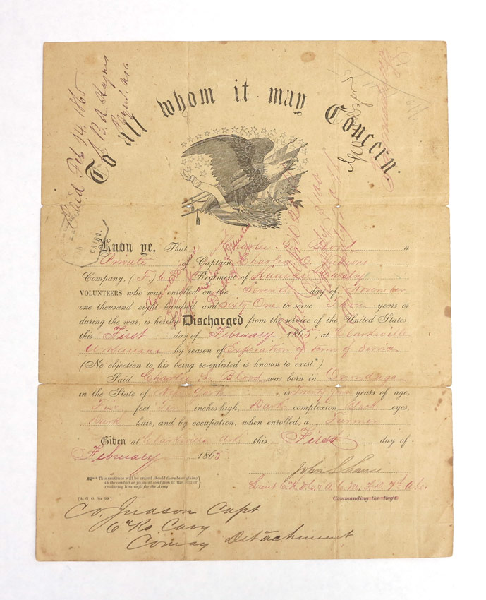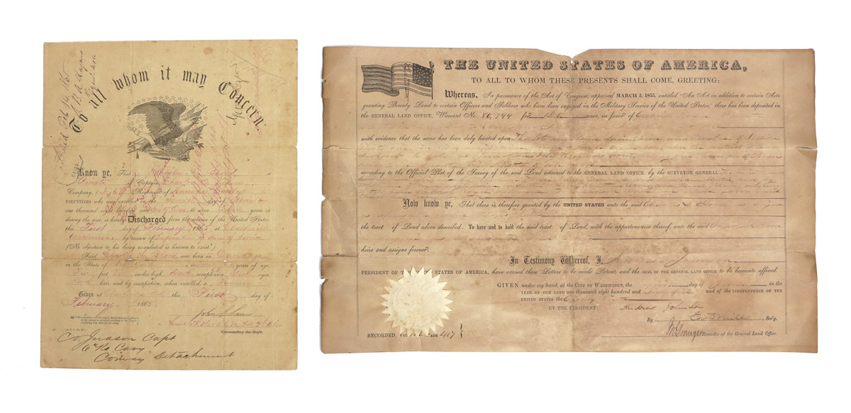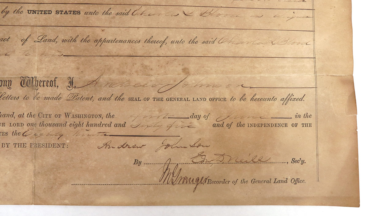 CIVIL WAR DISCHARGE & LAND GRANT: Both items related to Charles L. Blood, private in the 6th Kansas, Regiment F. To include 1) Civil War discharge paper dated 1865 for 3 years of service. 10 3/4'' x 8 1/2''. 2) Andrew Johnson secretarial signed military land grant of 120 acres. 10'' x 16''.
