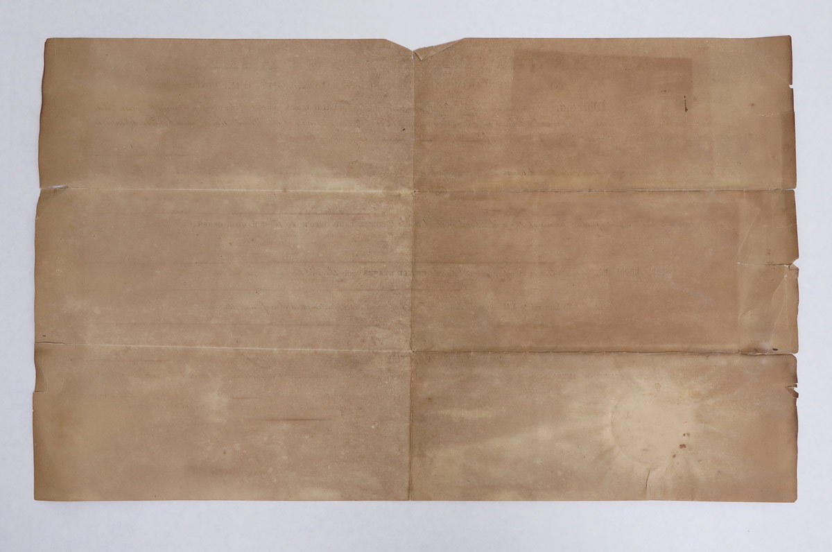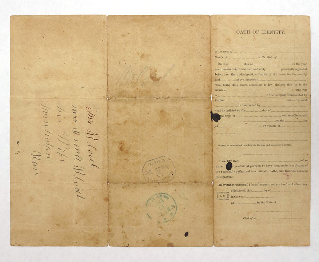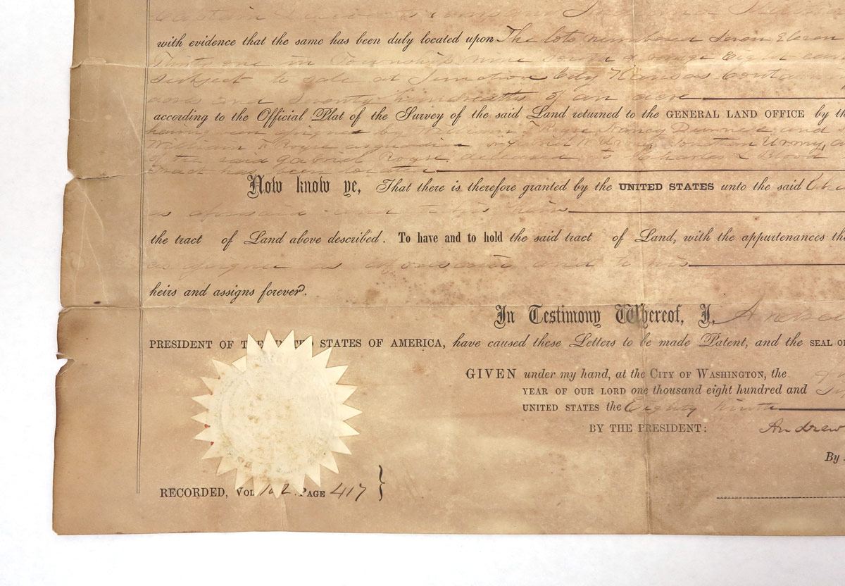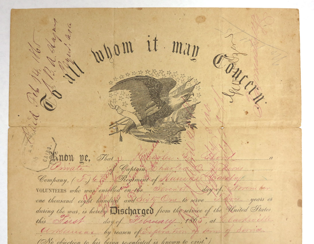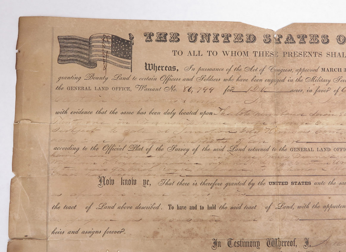 CIVIL WAR DISCHARGE & LAND GRANT: Both items related to Charles L. Blood, private in the 6th Kansas, Regiment F. To include 1) Civil War discharge paper dated 1865 for 3 years of service. 10 3/4'' x 8 1/2''. 2) Andrew Johnson secretarial signed military land grant of 120 acres. 10'' x 16''.