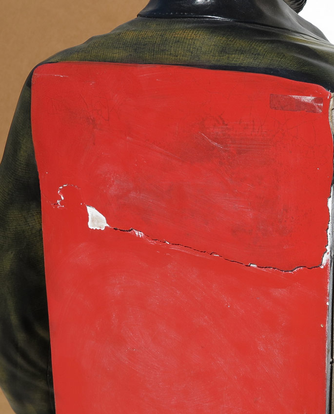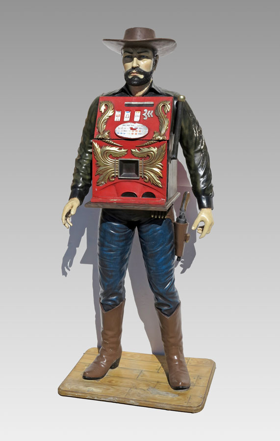 LIFE SIZE WESTERN MAN FIGURE WITH FAUX SLOT MACHINE: Composite figure of a man dressed in western garb with a faux slot machine in chest. Doors of slot machine open to reveal 2 storage spaces. Overall measures 72'' h. x 30'' x 21''.