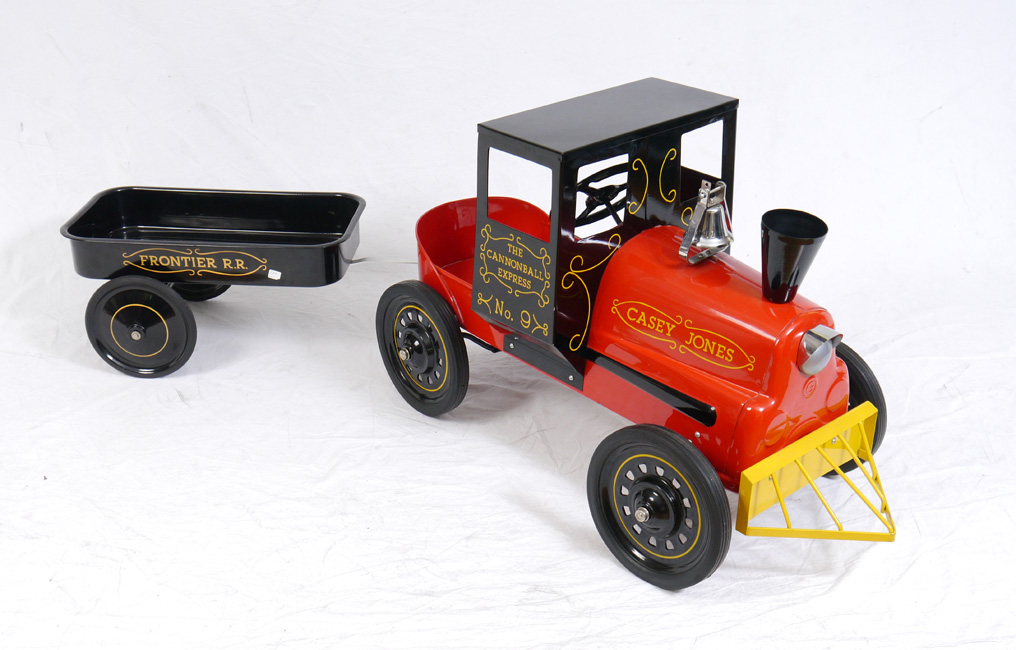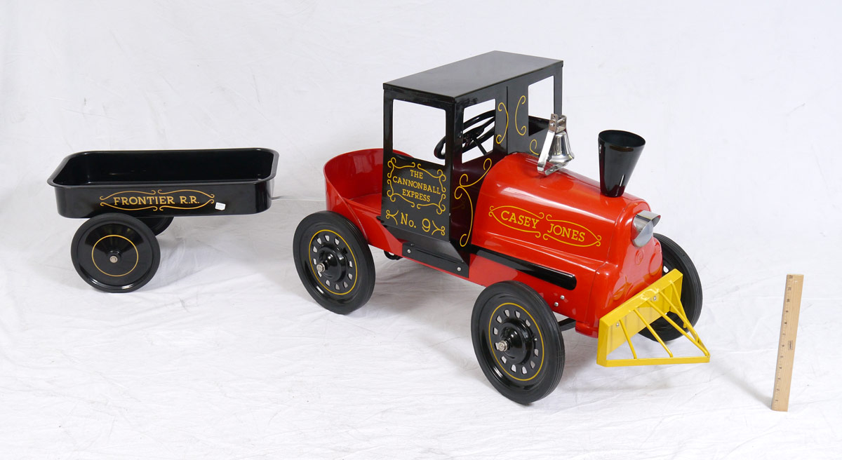GARTON CASEY JONES CANNONBALL EXPRESS PEDAL CAR: Early 1960's Garton manufactured Casey Jones The Cannonball Express No. 9 pressed steel pedal car and Frontier R.R. trailer in restored condition. Car measures 24 1/4'' h. x 42'' x 18'', trailer 11'' x 22'' x 16 1/2''.