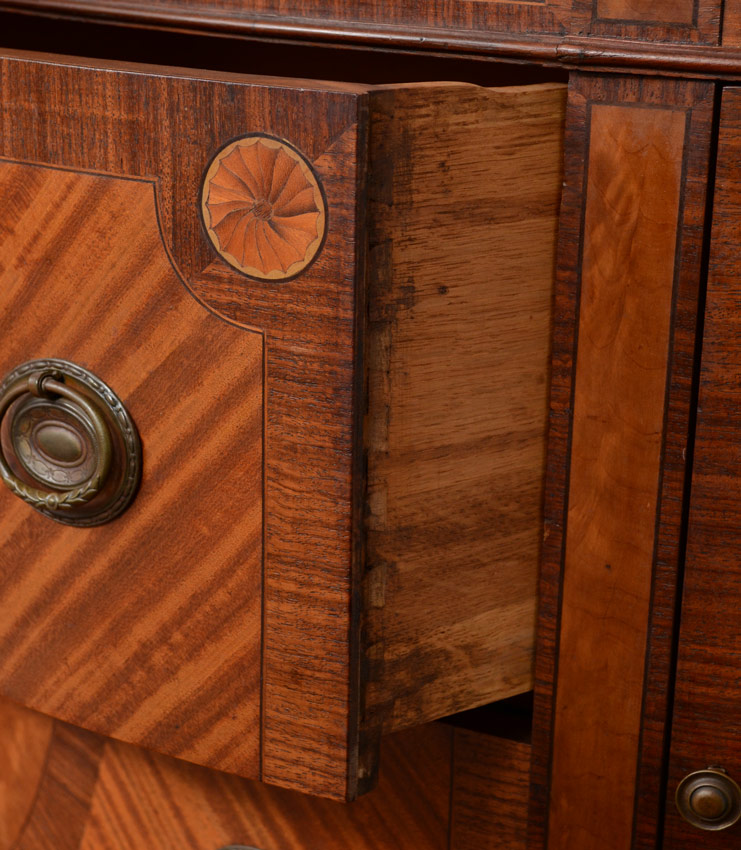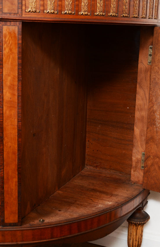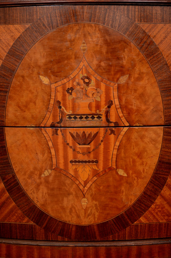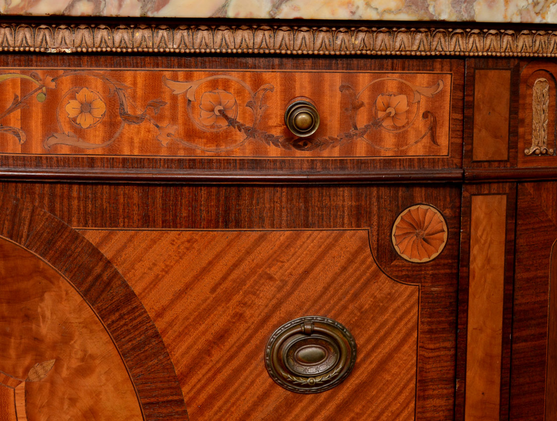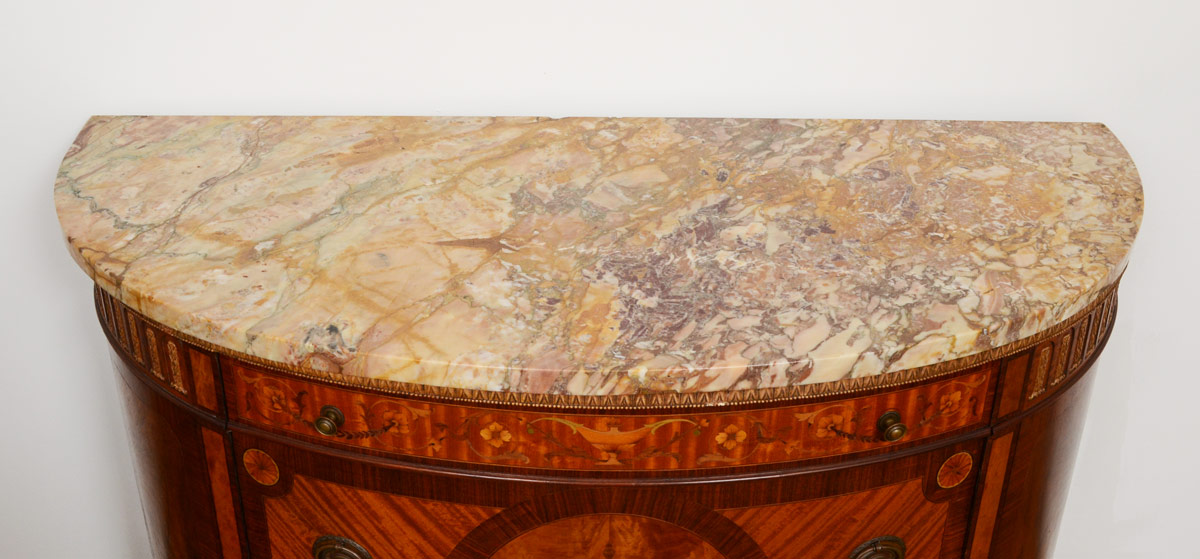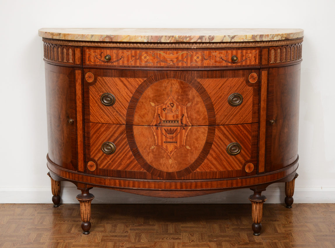 FRENCH MARQUETRY INLAID MARBLE TOP COMMODE: Variegated marble top over single shallow drawer with urn and floral garland inlay. 2 deep lower drawers with marquetry inlay surmounted by door on each side. Carved legs. 34 3/4'' h. x 48'' x 21 1/2''.