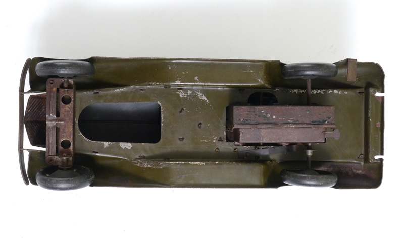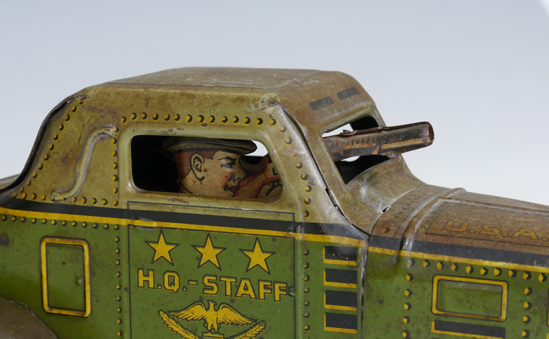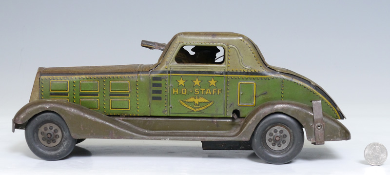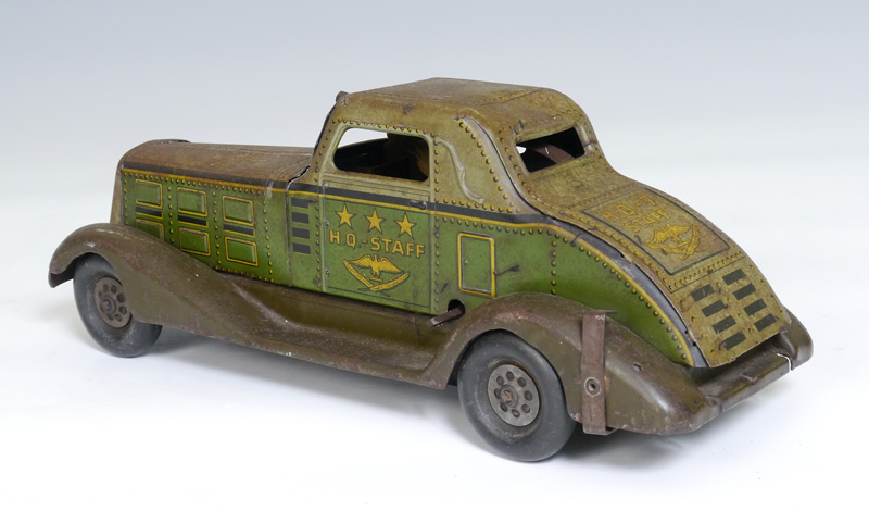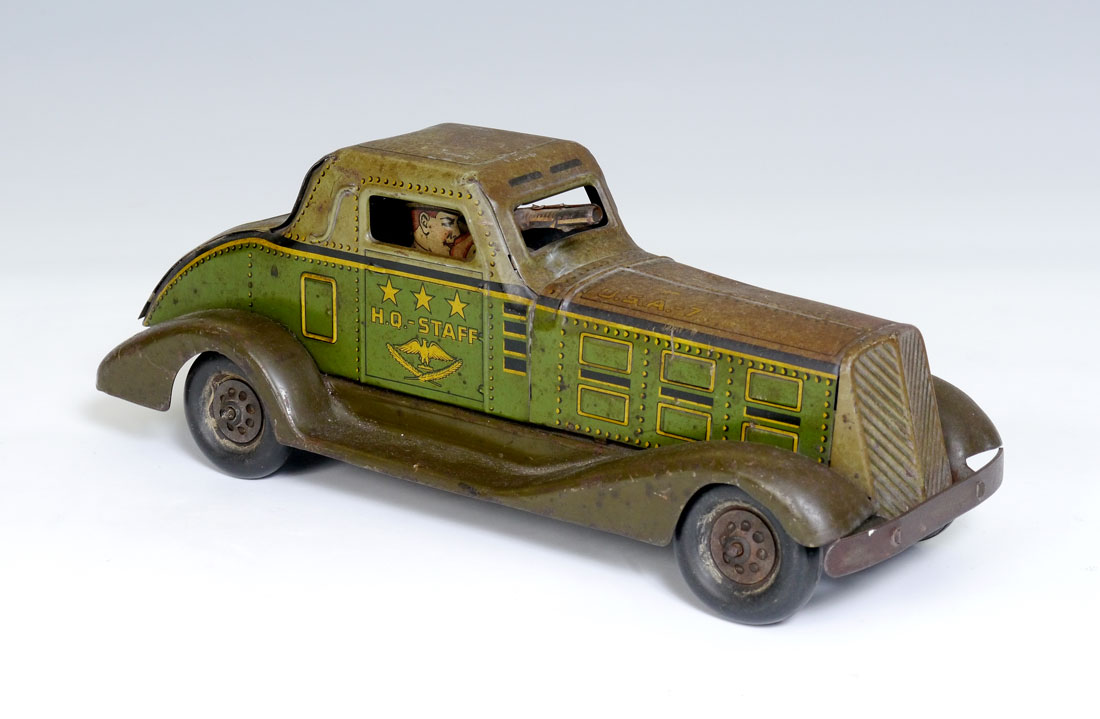 MARX HQ STAFF PRESSED STEEL TOY CAR: Wind-up toy car by Marx marked ''H.Q.-7 STAFF''. Original condition, missing key. 5 1/4'' h. x 14 1/4'' x 5''.