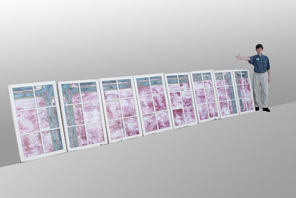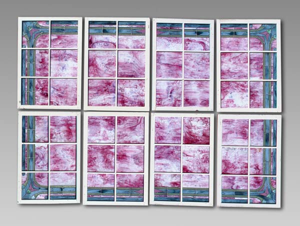 SET OF EIGHT SLAG GLASS WINDOWS: Salvaged from the foyer skylight of an old St Petersburg, FL hotel, one of the first in St Petersburg to have running water. Now the site of The Indigo Hotel, 234 3rd Ave N. Each window panel measures 44 3/8'' x 31''.