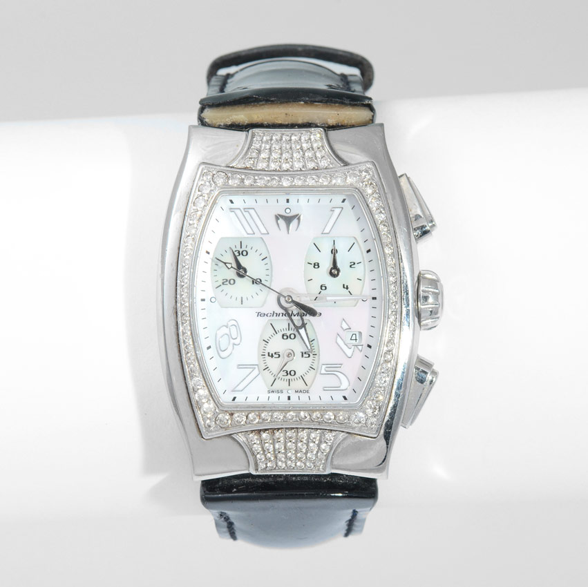 TECHNOMARINE DIAMOND & STAINLESS WATCH: Stainless case with diamonds and original black patent leather strap. Mother of pearl dial. Myota quartz movement in good working order. Length: 9''.