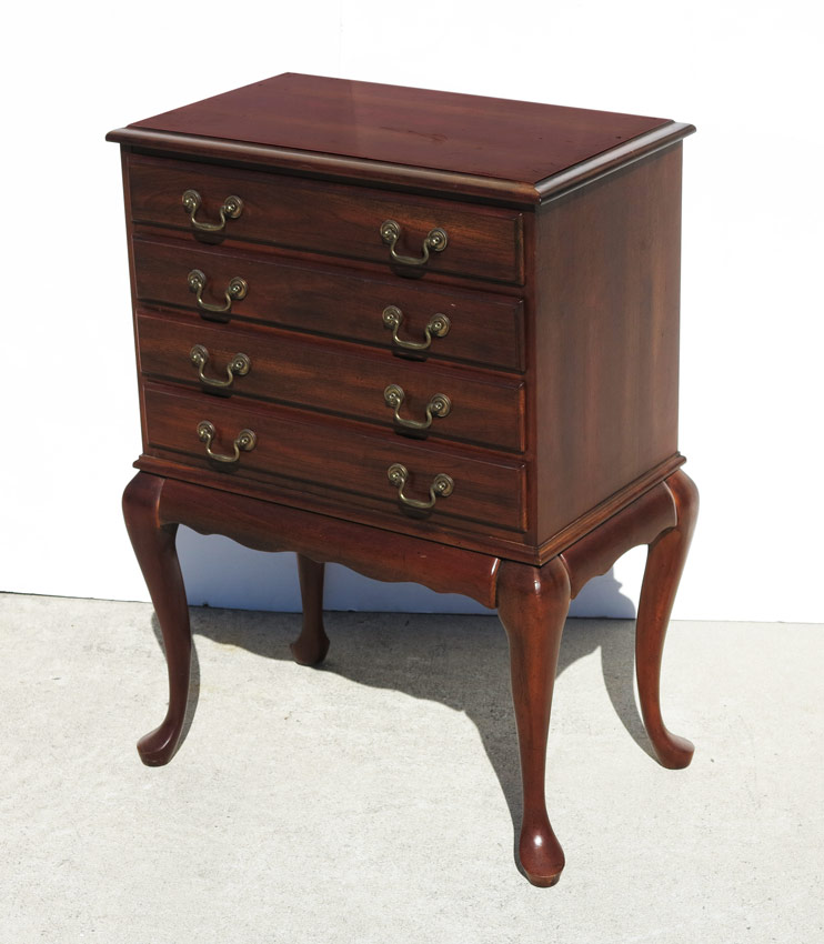 QUEEN ANNE STYLE CHERRY SILVER CHEST BY CRESCENT FURNITURE: 4 green felt lined compartmented drawers on Queen Anne legs. 34'' h. x 24'' x 15 1/2''.