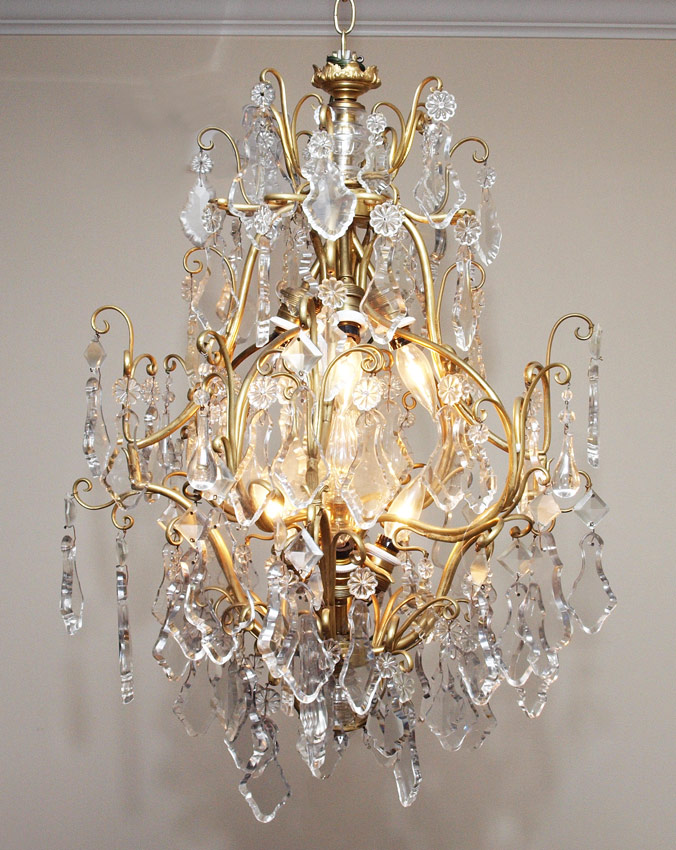 2 TIER BRASS AND CRYSTAL DROP CHANDELIER: 8 light brass frame with crystal drops and prisms. 28'' h. excluding chain x 22'' dia.