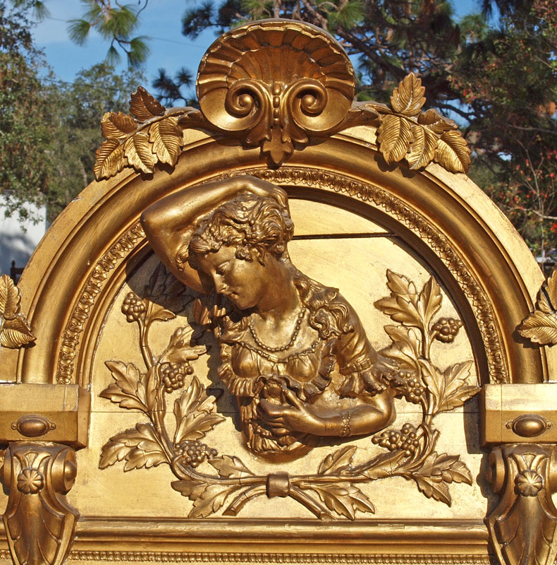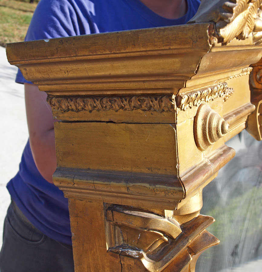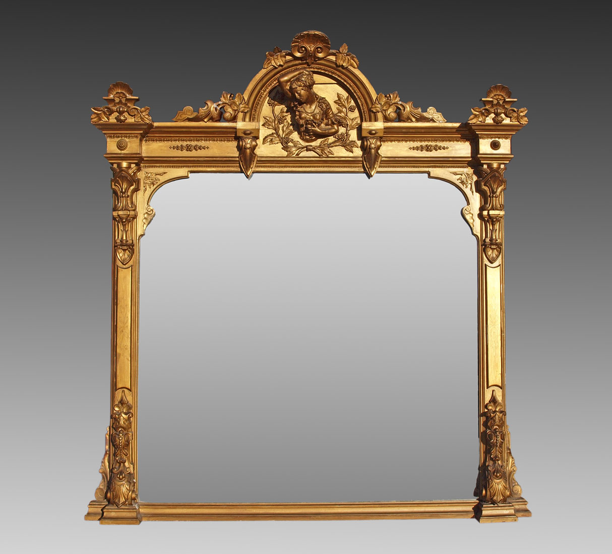FIGURAL 19TH C VICTORIAN GILT WOOD & GESSO WALL MIRROR: Shell and foliate shaped crest over figural maiden in high relief. Other high Victorian motif decoration surmounting mirror. Overall measures 69 1/2'' x 63'' x 5 1/2''.