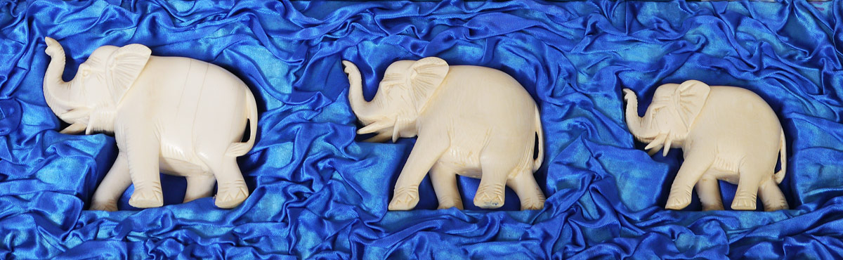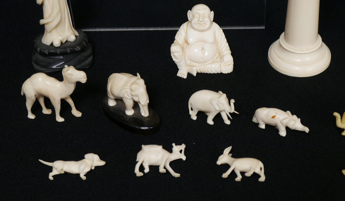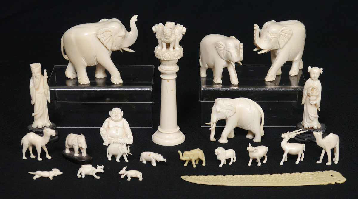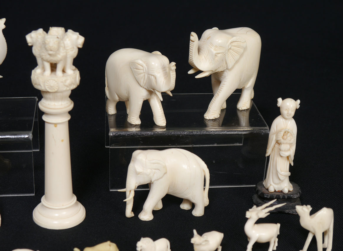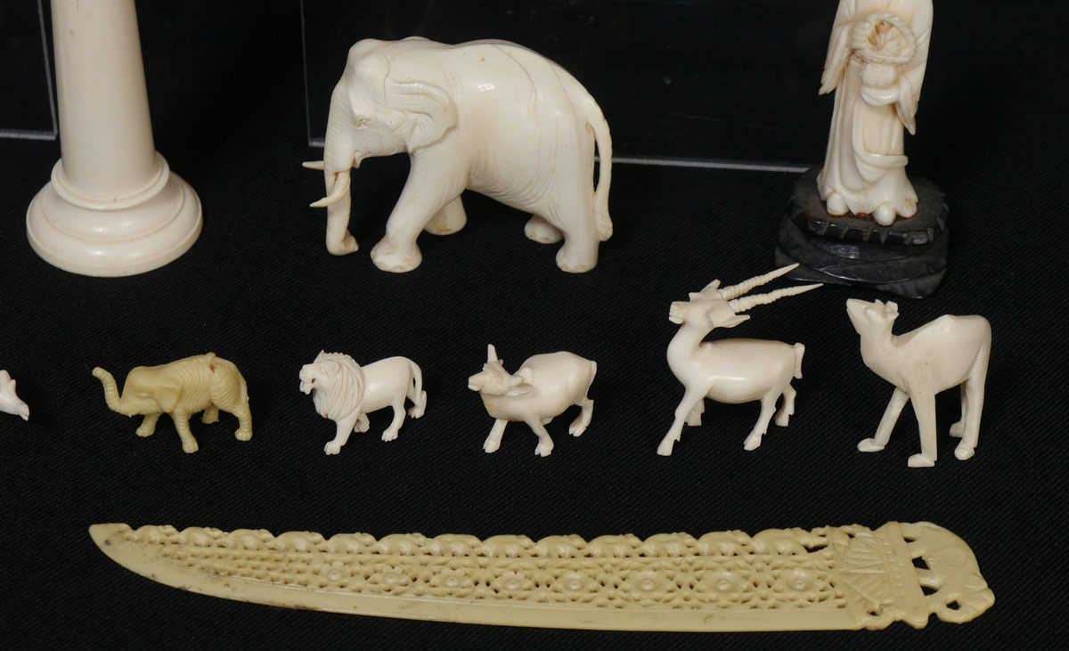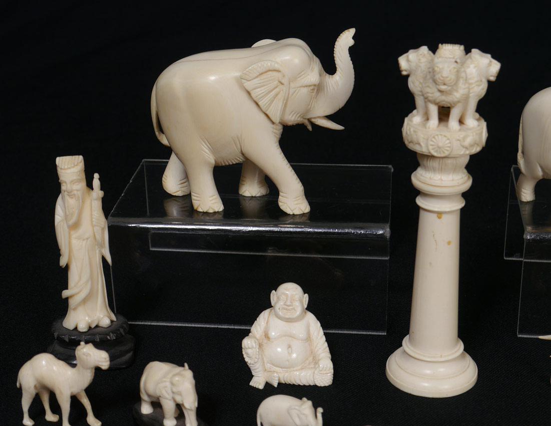19 PIECE CARVED IVORY ANIMAL MENAGERIE: 21 pieces total of which 19 are carved ivory. Ivory to include figure of Buddha, Chinese man and woman, many elephants, camels, oxen, impala, lion, and dachshund (missing foot). Largest elephant (3'' h. x 3 3/4'' x 1 1/2'') from a set of three in cased presentation box (2 1/2'' x 16 1/4'' x 5 7/8''). Sold with plastic elephant and page turner and additional presentation box (6 1/4'' h. x 17 1/4'' x 4 1/4'').